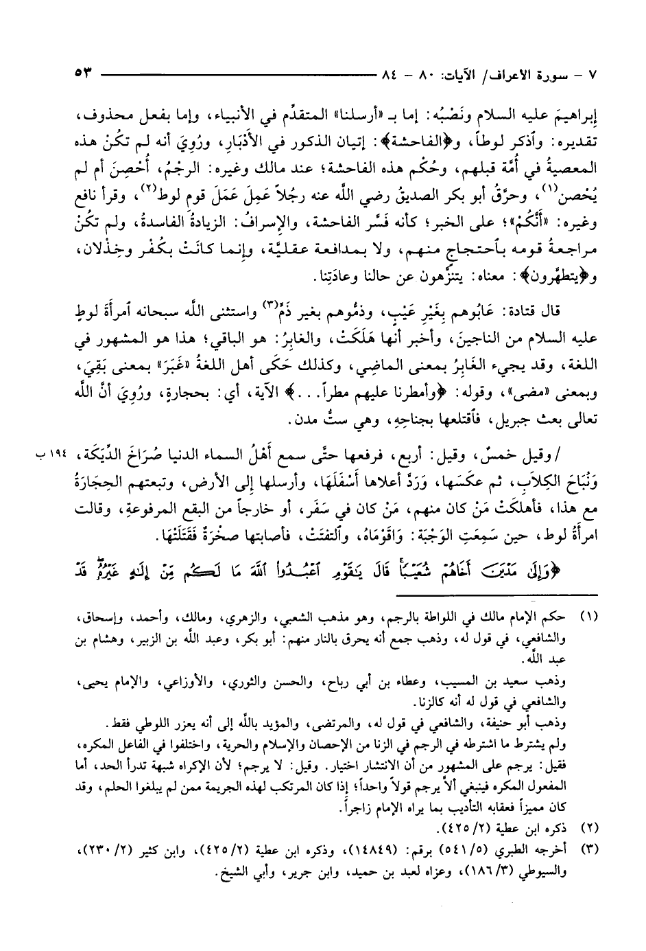 إِبراهيمَ عليه السلام ونَصْبُه: إما ب «أرسلنا» المتقدِّم في الأنبياء، وإما بفعل محذوف، تقديره: واذكر لوطا، والْفاحِشَةَ: إتيان الذكور في الأَدْبَارِ، ورُوِيَ أنه لم تكُنْ هذه المعصيةُ في أُمَّة قبلهم، وحُكْم هذه الفاحشة عند مالك وغيره: الرجْمُ، أُحْصِنَ أم لم يُحْصن «1» ، وحرَّقُ أبو بكر الصديقُ رضي الله عنه رجلا عمل عَمِلَ قومِ لوط «2» ، وقرأ نافع وغيره: «أَنَّكُمْ» على الخبر كأنه فَسَّر الفاحشة، والإِسرافُ: الزيادةُ الفاسدةُ، ولم تكُنْ مراجعةُ قومه باحتجاج منهم، ولا بمدافعة عقليَّة، وإِنما كانَتْ بكُفْر وخِذْلان، ويَتَطَهَّرُونَ: معناه: يتنزَّهون عن حالنا وعادَتِنا.