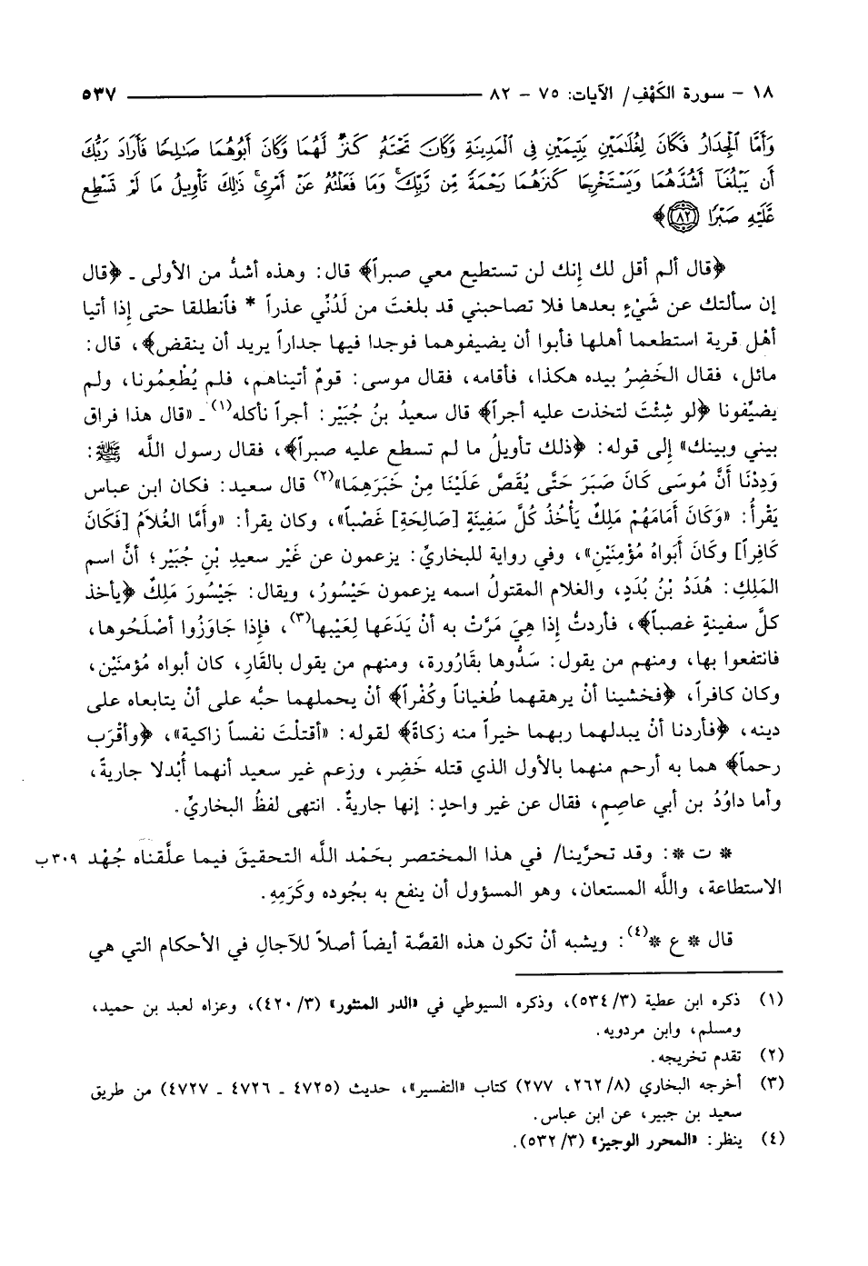 وَدِدْنَا أَنَّ مُوسَى كَانَ صَبَرَ حَتَّى يُقَصَّ عَلَيْنَا مِنْ خَبَرَهِمَا» «2» قال سعيد: فكان ابن عباس يَقْرأُ: «وَكَانَ أَمَامَهُمْ مَلِكٌ يَأْخُذُ كُلَّ سفينة [صالحة] غصبا» ، وكان يقرأ: «وأَمَّا الغُلاَمُ [فَكَانَ كَافِراً] وكَانَ أَبَواهُ مُؤْمِنَيْنِ» ، وفي رواية للبخاريِّ: يزعمون عن غَيْر سعيدِ بْنِ جُبَيْر أنَّ اسم المَلِكِ: هُدَدُ بْنُ بُدَدٍ، والغلام المقتولُ اسمه يزعمون حَيْسُورُ، ويقال: جَيْسُورَ مَلِكٌ يَأْخُذُ كُلَّ سَفِينَةٍ غَصْباً، فأردتُّ إِذا هِيَ مَرَّتْ به أنْ يَدَعَها لِعَيْبها «3» ، فإِذا جَاوَزُوا أصْلَحُوها، فانتفعوا بها، ومنهم من يقول: سَدُّوها بقَارُورة، ومنهم من يقول بالقار، كان أَبَوَاهُ مُؤْمِنَيْنِ، وكان كافراً، فَخَشِينا أَنْ يُرْهِقَهُما طُغْياناً وَكُفْراً أنْ يحملهما حبُّه على أنْ يتابعاه على دينه، فَأَرَدْنا أَنْ يُبْدِلَهُما رَبُّهُما خَيْراً مِنْهُ زَكاةً لقوله: «أقتلْتَ نفساً زاكية» ، وَأَقْرَبَ رُحْماً هما به أرحم منهما بالأول الذي قتله خَضِر، وزعم غير سعيد أنهما أُبْدلا جاريةً، وأما داوُدُ بن أبي عاصِمٍ، فقال عن غير واحدٍ: إنها جاريةٌ. انتهى لفظُ البخاريِّ.