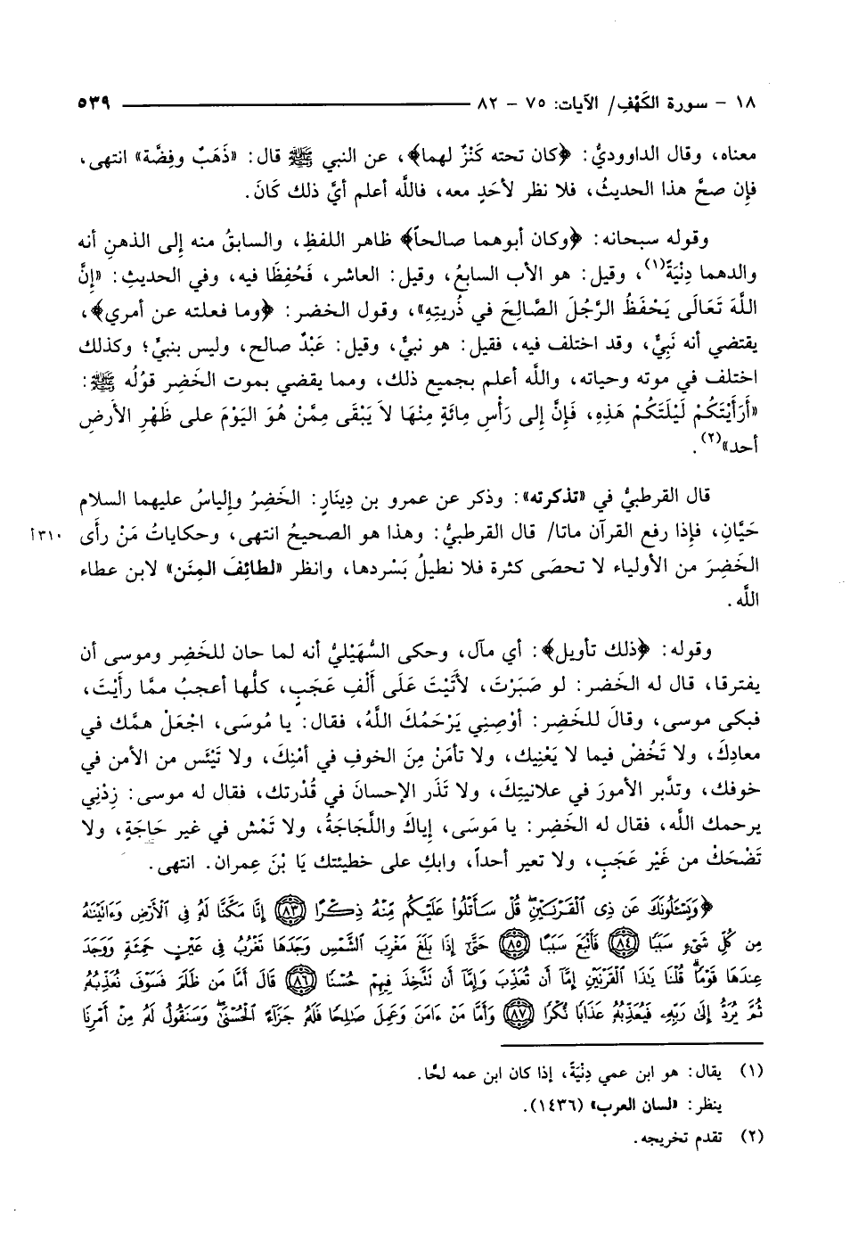 وقوله سبحانه: وَكانَ أَبُوهُما صالِحاً ظاهر اللفظِ، والسابقُ منه إِلى الذهنِ أنه والدهما دِنْيَةً «1» ، وقيل: هو الأب السابعُ، وقيل: العاشر، فَحُفِظَا فيه، وفي الحديثِ: «إِنَّ اللَّهَ تَعَالَى يَحْفَظُ الرَّجُلَ الصَّالِحَ في ذُريتِهِ» ، وقول الخضر: وَما فَعَلْتُهُ عَنْ أَمْرِي، يقتضي أنه نَبِيٌّ، وقد اختلف فيه، فقيل: هو نبيٌّ، وقيل: عَبْدٌ صالح، وليس بنبيٍّ وكذلك اختلف في موته وحياته، واللَّه أعلم بجميع ذلك، ومما يقضي بموت الخضر قوله صلّى الله عليه وسلّم: