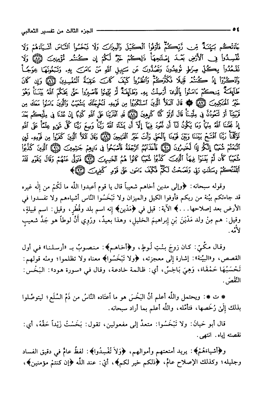 وَإِلى مَدْيَنَ أَخاهُمْ شُعَيْباً قالَ يا قَوْمِ اعْبُدُوا اللَّهَ ما لَكُمْ مِنْ إِلهٍ غَيْرُهُ قَدْ جاءَتْكُمْ بَيِّنَةٌ مِنْ رَبِّكُمْ فَأَوْفُوا الْكَيْلَ وَالْمِيزانَ وَلا تَبْخَسُوا النَّاسَ أَشْياءَهُمْ وَلا تُفْسِدُوا فِي الْأَرْضِ بَعْدَ إِصْلاحِها ذلِكُمْ خَيْرٌ لَكُمْ إِنْ كُنْتُمْ مُؤْمِنِينَ (85) وَلا تَقْعُدُوا بِكُلِّ صِراطٍ تُوعِدُونَ وَتَصُدُّونَ عَنْ سَبِيلِ اللَّهِ مَنْ آمَنَ بِهِ وَتَبْغُونَها عِوَجاً وَاذْكُرُوا إِذْ كُنْتُمْ قَلِيلاً فَكَثَّرَكُمْ وَانْظُرُوا كَيْفَ كانَ عاقِبَةُ الْمُفْسِدِينَ (86) وَإِنْ كانَ طائِفَةٌ مِنْكُمْ آمَنُوا بِالَّذِي أُرْسِلْتُ بِهِ وَطائِفَةٌ لَمْ يُؤْمِنُوا فَاصْبِرُوا حَتَّى يَحْكُمَ اللَّهُ بَيْنَنا وَهُوَ خَيْرُ الْحاكِمِينَ (87) قالَ الْمَلَأُ الَّذِينَ اسْتَكْبَرُوا مِنْ قَوْمِهِ لَنُخْرِجَنَّكَ يا شُعَيْبُ وَالَّذِينَ آمَنُوا مَعَكَ مِنْ قَرْيَتِنا أَوْ لَتَعُودُنَّ فِي مِلَّتِنا قالَ أَوَلَوْ كُنَّا كارِهِينَ (88) قَدِ افْتَرَيْنا عَلَى اللَّهِ كَذِباً إِنْ عُدْنا فِي مِلَّتِكُمْ بَعْدَ إِذْ نَجَّانَا اللَّهُ مِنْها وَما يَكُونُ لَنا أَنْ نَعُودَ فِيها إِلاَّ أَنْ يَشاءَ اللَّهُ رَبُّنا وَسِعَ رَبُّنا كُلَّ شَيْءٍ عِلْماً عَلَى اللَّهِ تَوَكَّلْنا رَبَّنَا افْتَحْ بَيْنَنا وَبَيْنَ قَوْمِنا بِالْحَقِّ وَأَنْتَ خَيْرُ الْفاتِحِينَ (89)