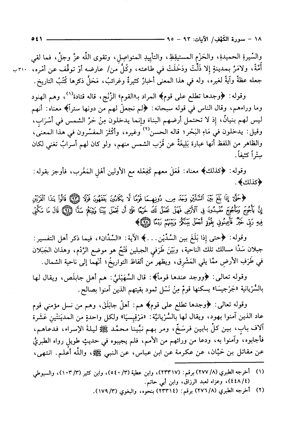 وقوله تعالى: وَجَدَها تَطْلُعُ عَلى قَوْمٍ هم: أهلُ جابَلَقَ، وهم من نسل مؤمني قوم عاد الذين آمنوا بهود، ويقال لها بالسُّرْيانيَّة: «مَرْقِيِسيَا» ولكل واحدةٍ من المديَنتْينِ عَشَرة آلاف بابٍ، بين كلِّ بابين فرسَخٌ، ومر بهم نبيّنا محمّد صلّى الله عليه وسلّم ليلةَ الإسراء، فدعاهم، فأجابوه، وآمنوا به، ودعا من ورائهم من الأمم، فلم يجيبوه في حديثٍ طويلٍ رواه الطبريُّ عن مقاتل بن حَيَّان، عن عكرمة عن ابن عباس، عن النبيّ صلّى الله عليه وسلّم، والله أعلم. انتهى،