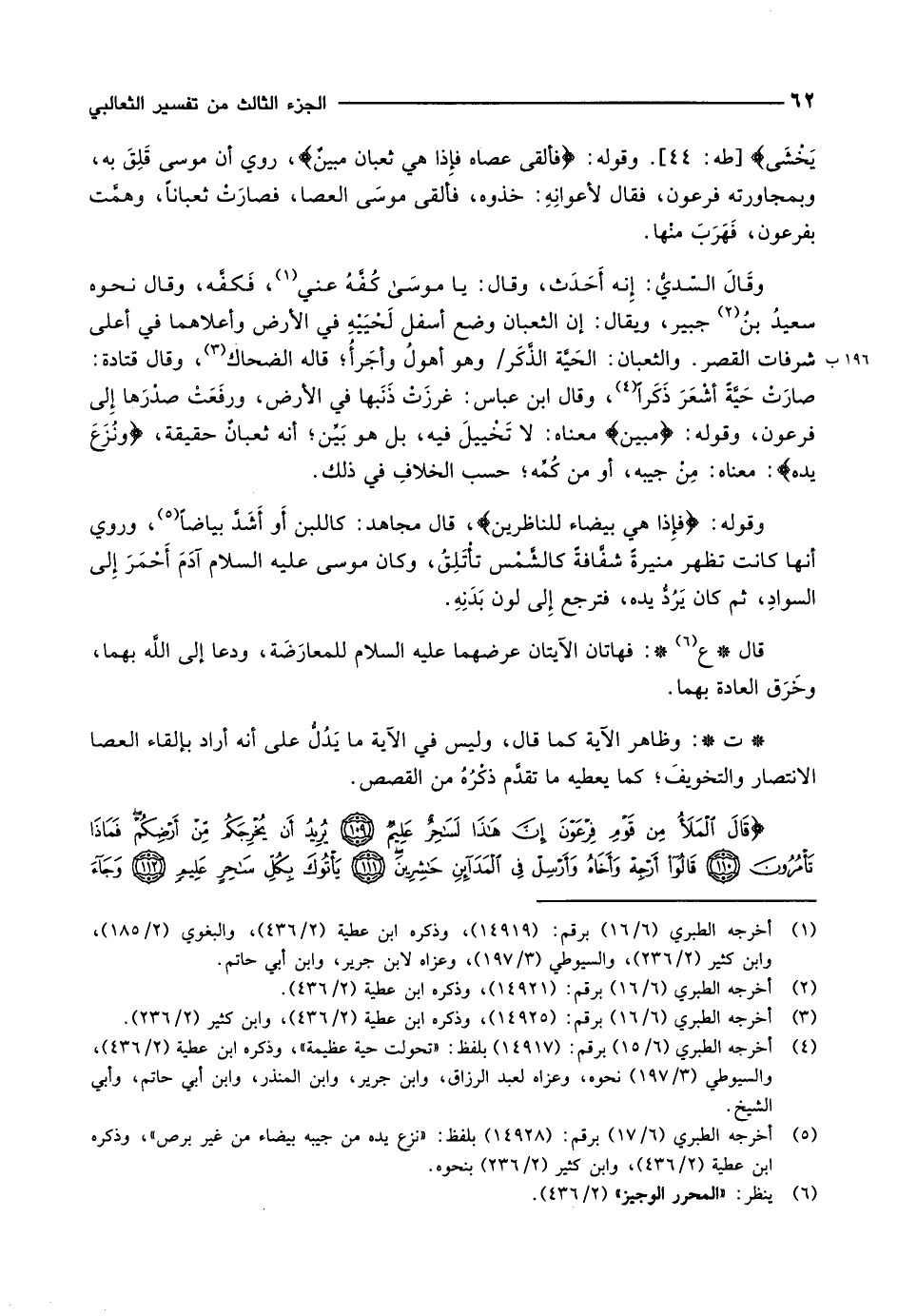 وقَالَ السّديُّ: إِنه أَحَدَث، وقال: يا موسى كُفَّهُ عني «1» ، فَكفَّه، وقال نحوه سعيدُ بنُ «2» جبير، ويقال: إن الثعبان وضع أسفل لَحْيَيْهِ في الأرض وأعلاهما في أعلى شرفات القصر. والثعبان: الحَيَّة الذَّكَر/ وهو أهولُ وأجَرأُ قاله الضحاك «3» ، وقال قتادة: