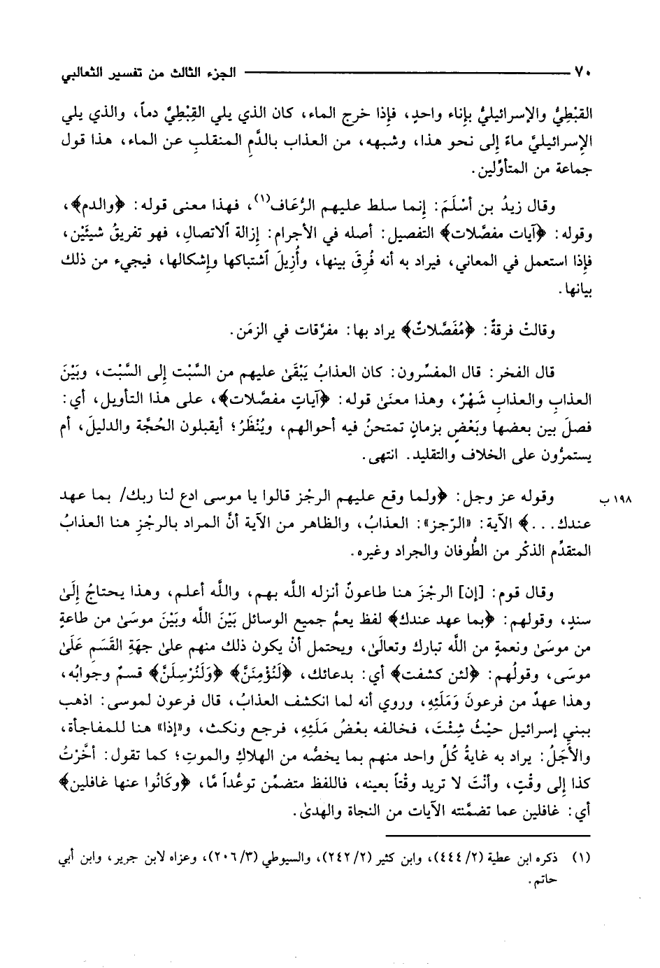 وقال قوم: [إن] الرجْزَ هنا طاعون أنزله اللَّه بهم، واللَّه أعلم، وهذا يحتاجُ إلى سندٍ، وقولهم: بِما عَهِدَ عِنْدَكَ لفظ يعمُّ جميع الوسائل بَيْنَ اللَّه وبَيْنَ موسى من طاعةٍ من موسى ونعمةٍ من اللَّه تبارك وتعالى، ويحتمل أنْ يكون ذلك منهم على جهَةِ القَسَمِ على موسَى، وقولُهم: لَئِنْ كَشَفْتَ أي: بدعائك، لَنُؤْمِنَنَّ وَلَنُرْسِلَنَّ قسمٌ وجوابُه، وهذا عهدٌ من فرعونَ وَمَلَئِهِ، وروي أنه لما انكشف العذابُ، قال فرعون لموسى: اذهب ببني إسرائيل حيْثُ شِئْتَ، فخالفه بعْضُ مَلَئِهِ، فرجع ونكث، و «إذا» هنا للمفاجأة، والأَجَلُ: يراد به غايةُ كُلِّ واحد منهم بما يخصُّه من الهلاكِ والموتِ كما تقول: أخَّرْتُ كذا إِلى وقْتٍ، وأنْتَ لا تريد وقْتاً بعينه، فاللفظ متضمِّن توعُّداً مَّا، وَكانُوا عَنْها غافِلِينَ أي: غافلين عما تضمَّنته الآيات من النجاة والهدى.
