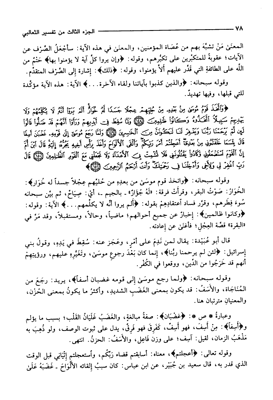 وقوله سبحانه: وَلَمَّا رَجَعَ مُوسى إِلى قَوْمِهِ غَضْبانَ أَسِفاً، يريد: رجَعَ من المُنَاجَاة، والأَسَفُ: قد يكون بمعنى الغَضَبِ الشديدِ، وأكثرُ ما يكونُ بمعنى الحُزْن، والمعنيانِ مترتبان هنا.