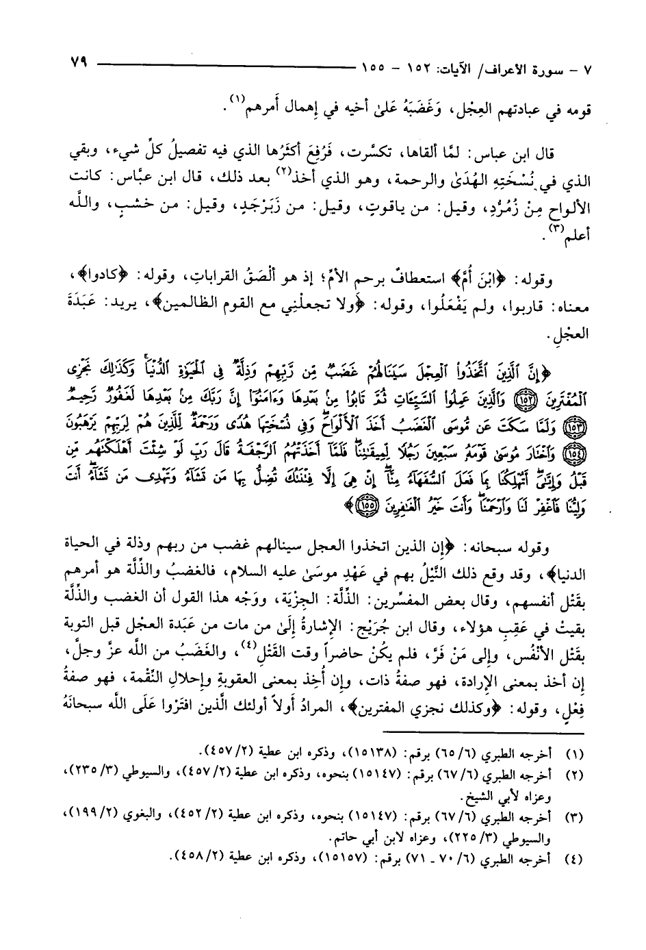 إِنَّ الَّذِينَ اتَّخَذُوا الْعِجْلَ سَيَنالُهُمْ غَضَبٌ مِنْ رَبِّهِمْ وَذِلَّةٌ فِي الْحَياةِ الدُّنْيا وَكَذلِكَ نَجْزِي الْمُفْتَرِينَ (152) وَالَّذِينَ عَمِلُوا السَّيِّئاتِ ثُمَّ تابُوا مِنْ بَعْدِها وَآمَنُوا إِنَّ رَبَّكَ مِنْ بَعْدِها لَغَفُورٌ رَحِيمٌ (153) وَلَمَّا سَكَتَ عَنْ مُوسَى الْغَضَبُ أَخَذَ الْأَلْواحَ وَفِي نُسْخَتِها هُدىً وَرَحْمَةٌ لِلَّذِينَ هُمْ لِرَبِّهِمْ يَرْهَبُونَ (154) وَاخْتارَ مُوسى قَوْمَهُ سَبْعِينَ رَجُلاً لِمِيقاتِنا فَلَمَّا أَخَذَتْهُمُ الرَّجْفَةُ قالَ رَبِّ لَوْ شِئْتَ أَهْلَكْتَهُمْ مِنْ قَبْلُ وَإِيَّايَ أَتُهْلِكُنا بِما فَعَلَ السُّفَهاءُ مِنَّا إِنْ هِيَ إِلاَّ فِتْنَتُكَ تُضِلُّ بِها مَنْ تَشاءُ وَتَهْدِي مَنْ تَشاءُ أَنْتَ وَلِيُّنا فَاغْفِرْ لَنا وَارْحَمْنا وَأَنْتَ خَيْرُ الْغافِرِينَ (155)