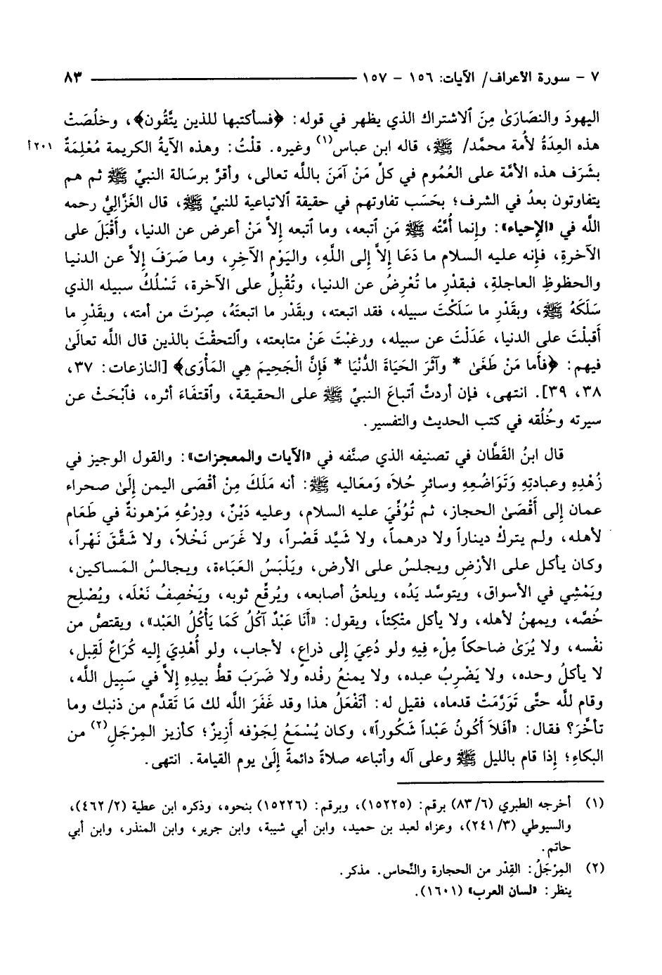 اليهودَ والنصارى مِنَ الاشتراك الذي يظهر في قوله: فَسَأَكْتُبُها لِلَّذِينَ يَتَّقُونَ، وخلُصَتْ هذه العِدَةُ لأمة محمّد/ صلّى الله عليه وسلّم، قاله ابن عباس «1» وغيره. قلْتُ: وهذه الآيةُ الكريمة مُعْلِمَةٌ بشَرَف هذه الأمَّة على العُمُوم في كلِّ مَنْ آمَنَ باللَّه تعالى، وأقرَّ برسالة النبيّ صلّى الله عليه وسلّم ثم هم يتفاوتون بعدُ في الشرف بحَسَب تفاوتهم في حقيقة الاتباعية للنبيّ صلّى الله عليه وسلّم، قال الغَزَّالِيُّ رحمه اللَّه في «الإِحياء» : وإِنما أمّته صلّى الله عليه وسلّم مَنِ اتبعه، وما اتبعه إِلاَّ مَنْ أعرض عن الدنيا، وأَقْبَلَ على الآخرةِ، فإِنه عليه السلام ما دَعَا إِلاَّ إِلى اللَّهِ، واليَوْمِ الآخِرِ، وما صَرَفَ إِلاَّ عن الدنيا والحظوظِ العاجلةِ، فبقدْرِ ما تُعْرِضُ عن الدنيا، وتُقْبِلُ على الآخرة، تسلك سبيله الذي سلكه صلّى الله عليه وسلّم، وبقَدْرِ ما سَلَكْتَ سبيله، فقد اتبعته، وبقَدْر ما اتبعتَهُ، صِرْتَ من أمته، وبقَدْرِ ما أَقبلْتَ على الدنيا، عَدَلْتَ عن سبيله، ورغبْتَ عَنْ متابعته، والتحقت بالذين قال اللَّه تعالى فيهم: فَأَمَّا مَنْ طَغى وَآثَرَ الْحَياةَ الدُّنْيا فَإِنَّ الْجَحِيمَ هِيَ الْمَأْوى [النازعات: 37، 38، 39] . انتهى، فإن أردتّ اتباع النبيّ صلّى الله عليه وسلّم على الحقيقة، واقتفاء أثره، فابحث عن سيرته وخُلُقه في كتب الحديث والتفسير.