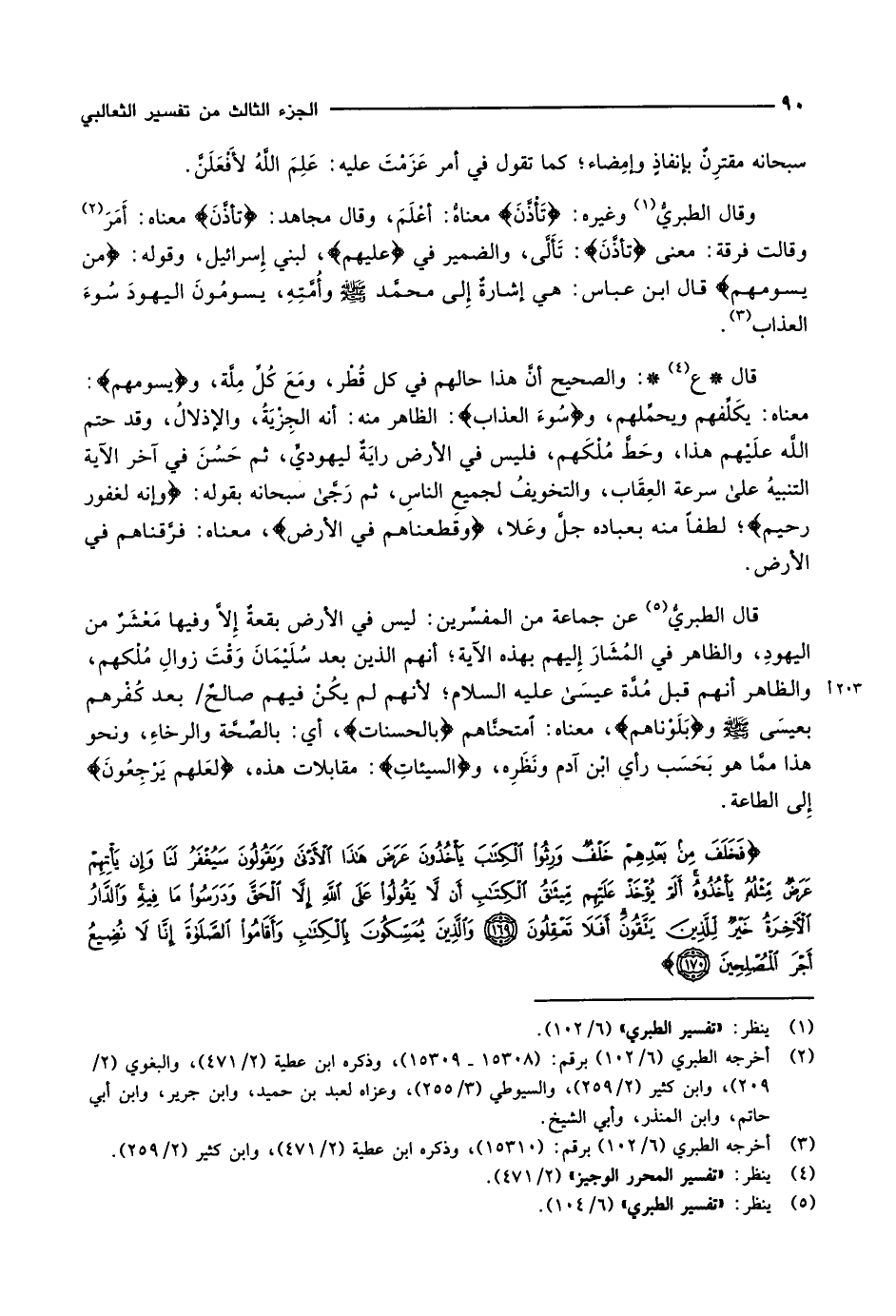 وقال الطبريُّ «1» وغيره: تَأَذَّنَ معناهُّ: أعْلَمَ، وقال مجاهد: تَأَذَّنَ معناه: أَمَرَ «2» وقالت فرقة: معنى تَأَذَّنَ: تَأَلَّى، والضمير في عَلَيْهِمْ، لبني إِسرائيل، وقوله: مَنْ يَسُومُهُمْ قال ابن عباس: هي إشارةٌ إلى محمّد صلّى الله عليه وسلّم وأُمَّتِهِ، يسومُونَ اليهودَ سُوءَ العذاب «3» .
