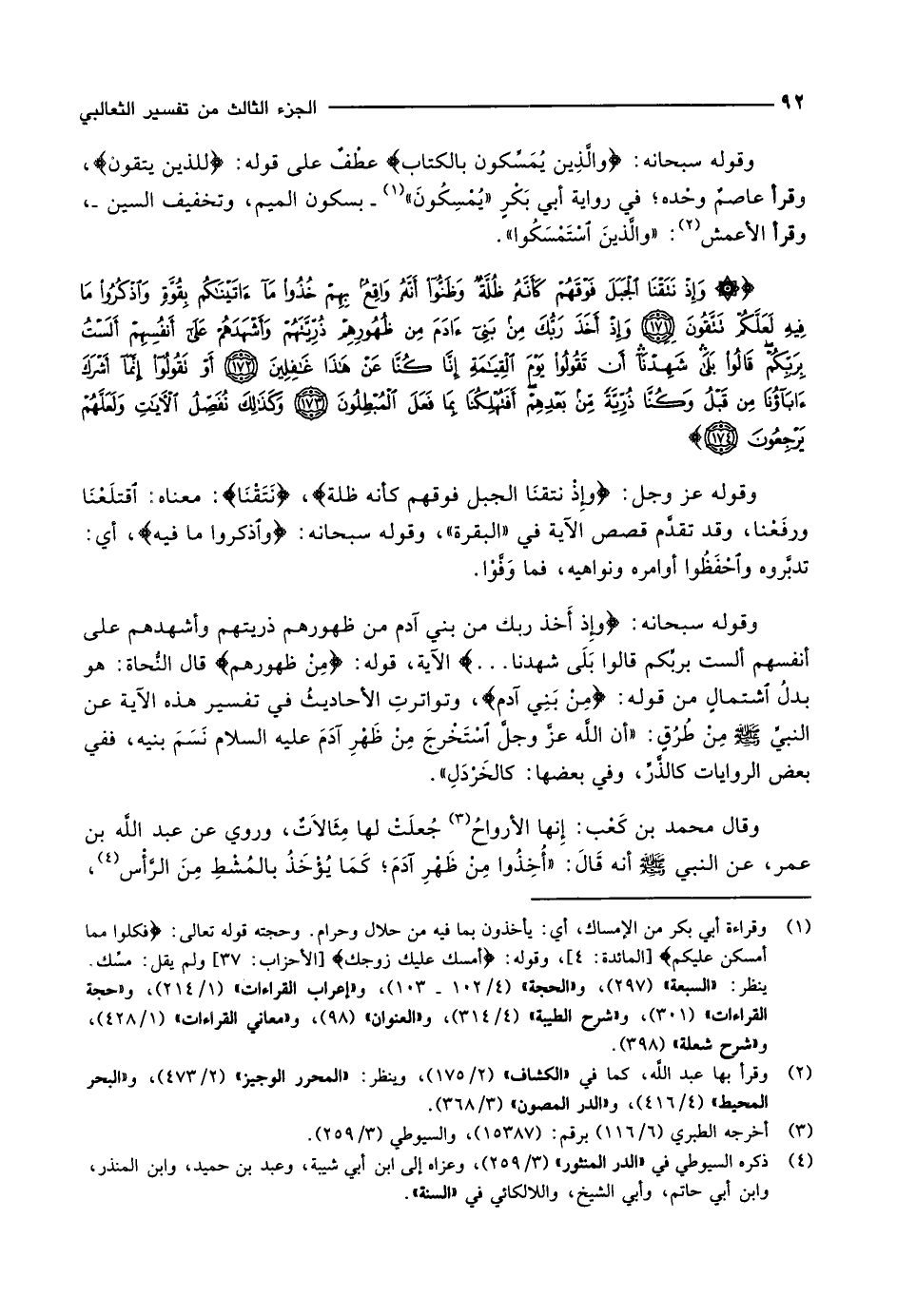 وقوله سبحانه: وَإِذْ أَخَذَ رَبُّكَ مِنْ بَنِي آدَمَ مِنْ ظُهُورِهِمْ ذُرِّيَّتَهُمْ وَأَشْهَدَهُمْ عَلى أَنْفُسِهِمْ أَلَسْتُ بِرَبِّكُمْ قالُوا بَلى شَهِدْنا ... الآية، قوله: مِنْ ظُهُورِهِمْ قال النُّحاة: هو بدلُ اشتمال من قوله: مِنْ بَنِي آدَمَ، وتواترتِ الأحاديثُ في تفسير هذه الآية عن النبيّ صلّى الله عليه وسلّم مِنْ طُرُقٍ: «أن اللَّه عزَّ وجلَّ استخرج مِنْ ظَهْرِ آدَمَ عليه السلام نَسَمَ بنيه، ففي بعض الروايات كالذَّرِّ، وفي بعضها: كالخَرْدَلِ» .