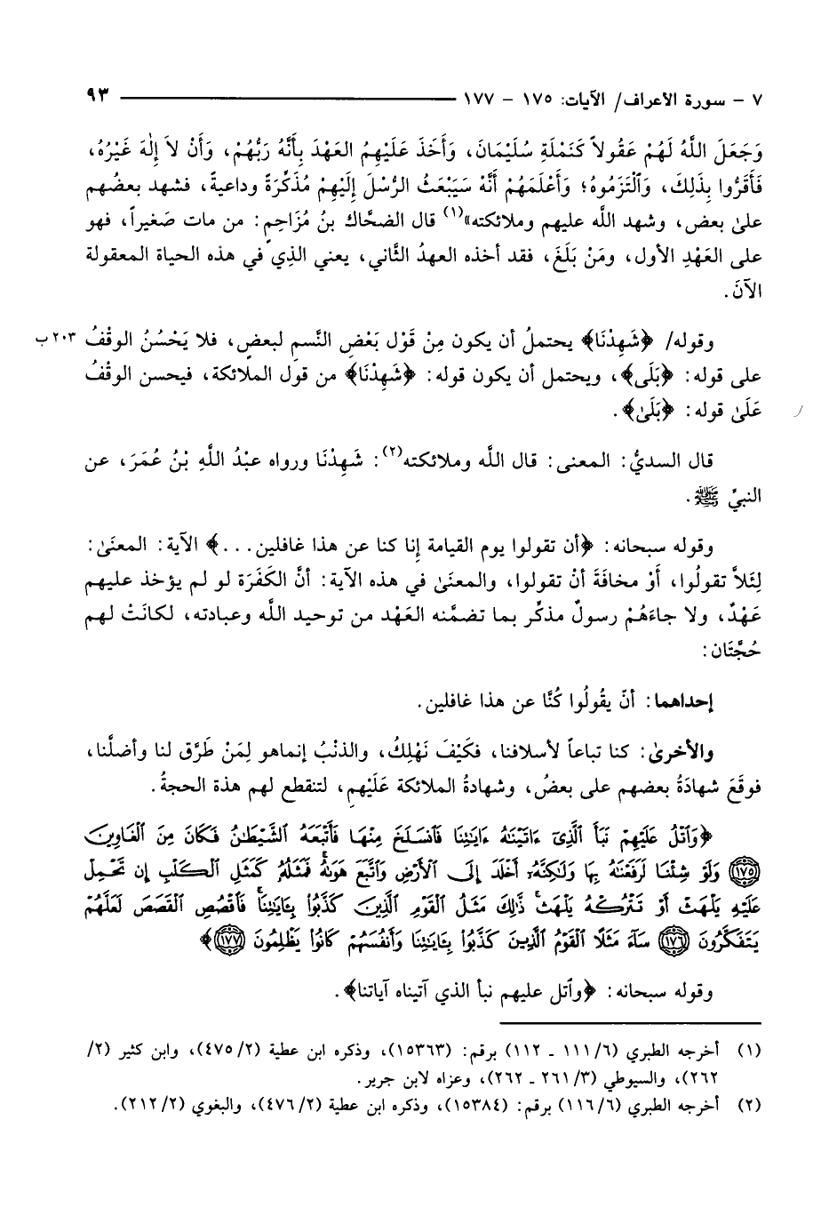 وقوله/ شَهِدْنا يحتملُ أن يكون مِنْ قَوْلَ بَعْضِ النَّسمِ لبعضٍ، فلا يَحْسِنُ الوقْفُ على قوله: بَلى، ويحتمل أن يكون قوله: شَهِدْنا من قول الملائكة، فيحسن الوقْفُ على قوله: بَلى.