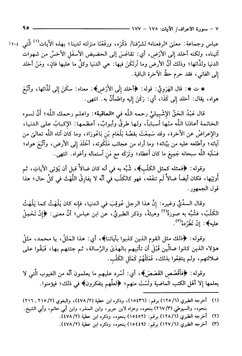 وقال السدِّيُّ وغيره: إِنَّ هذا الرجل عُوقِبَ في الدنيا، فإِنه كان يَلْهَثُ كما يَلْهَثُ الكَلْبُ، فشُبِّه به صورةً «2» وهيئةً، وذكر الطبريُّ، عن ابن عباس أنَّ معنى: إِنْ تَحْمِلْ عَلَيْهِ: إنْ تَطْرَدهُ «3» .