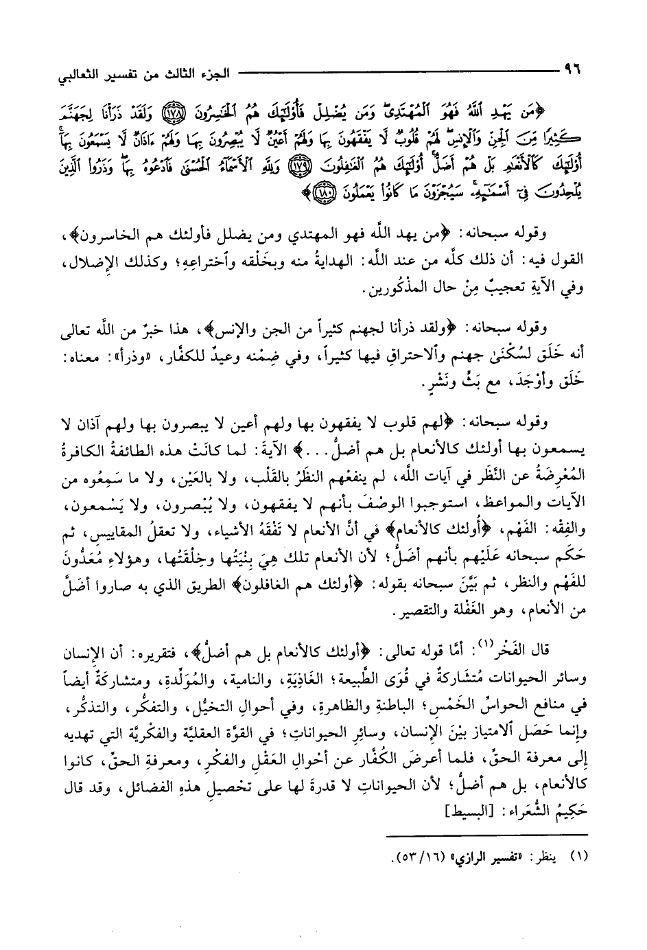 وقوله سبحانه: لَهُمْ قُلُوبٌ لاَّ يَفْقَهُونَ بِها وَلَهُمْ أَعْيُنٌ لاَّ يُبْصِرُونَ بِها وَلَهُمْ آذانٌ لاَّ يَسْمَعُونَ بِها أُولئِكَ كَالْأَنْعامِ بَلْ هُمْ أَضَلُّ ... الآيةَ: لما كانَتْ هذه الطائفةُ الكافرةُ المُعْرِضَةُ عن النَّظَر في آيات اللَّه، لم ينفعْهم النظَرُ بالقَلْب، ولا بالعَيْن، ولا ما سَمِعُوه من الآيات والمواعظ، استوجبوا الوصْفَ بأنهم لا يفقهون، ولا يُبْصرون، ولا يَسْمعون، والفِقْه: الفَهْم، أُولئِكَ كَالْأَنْعامِ في أنَّ الأنعام لا تَفْقَهُ الأشياء، ولا تعقلُ المقاييسِ، ثم حَكَم سبحانه عَلَيْهم بأنهم أضَلُّ لأن الأنعام تلك هِيَ بِنْيَتُها وخِلْقَتُها، وهؤلاءِ مُعَدُّونَ للفَهْم والنظر، ثم بَيَّنَ سبحانه بقوله: أُولئِكَ هُمُ الْغافِلُونَ الطريق الذي به صاروا أضَلَّ من الأنعام، وهو الغَفْلة والتقصير.