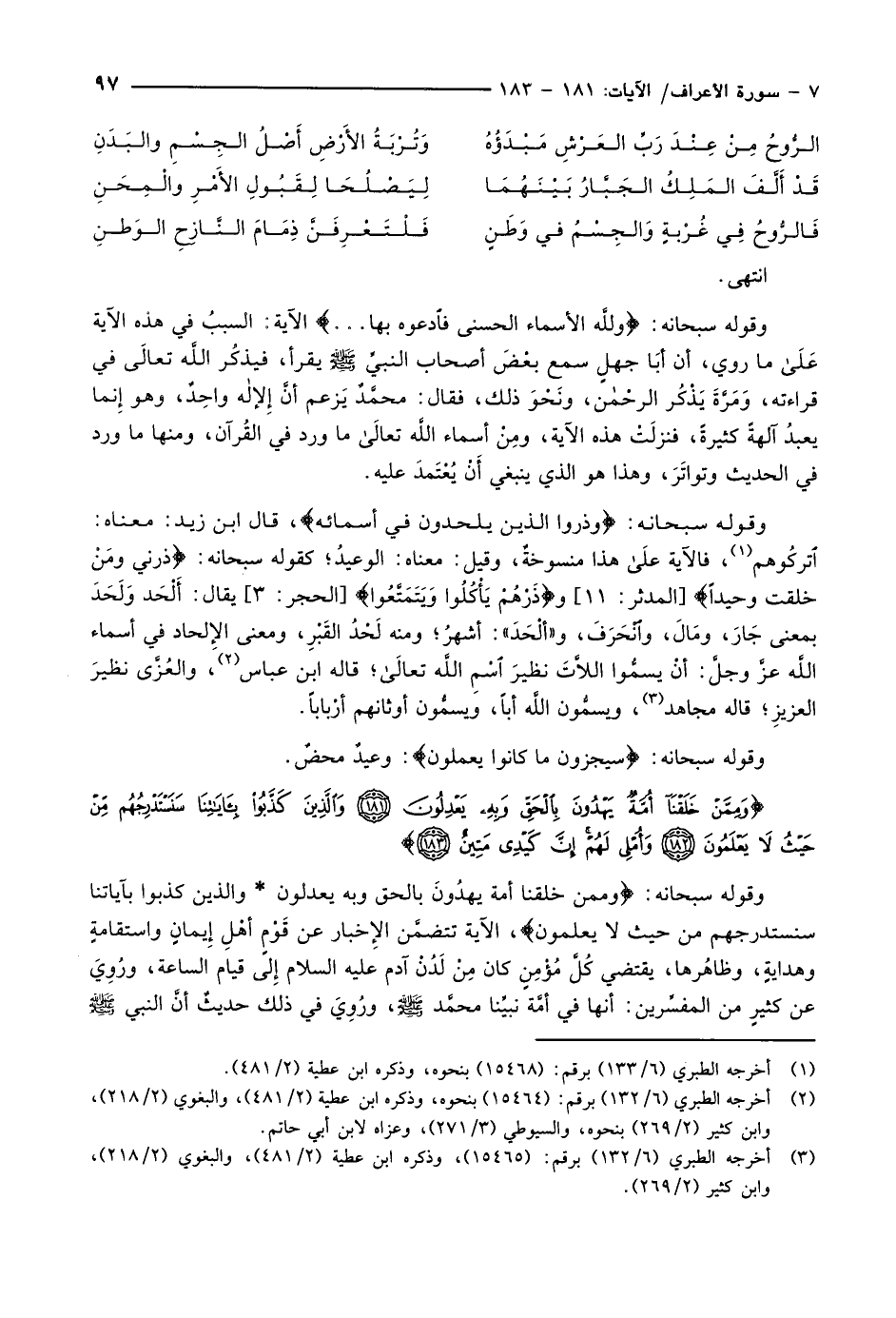 اتركوهم «1» ، فالآية على هذا منسوخةٌ، وقيل: معناه: الوعيدُ كقوله سبحانه: ذَرْنِي وَمَنْ خَلَقْتُ وَحِيداً [المدثر: 11] وذَرْهُمْ يَأْكُلُوا وَيَتَمَتَّعُوا [الحجر: 3] يقال: أَلْحَد وَلَحَدَ بمعنى جَارَ، ومَالَ، وانحرف، و «ألْحَدَ» : أشهرُ ومنه لَحْدُ القَبْرِ، ومعنى الإِلحاد في أسماء اللَّه عزَّ وجلَّ: أنْ يسمُّوا اللاَّتَ نظيرَ اسم اللَّه تعالى قاله ابن عباس «2» ، والعُزَّى نظيرَ العزيزِ قاله مجاهد «3» ، ويسمُّون اللَّه أباً، ويسمُّون أوثانهم أرْباباً.