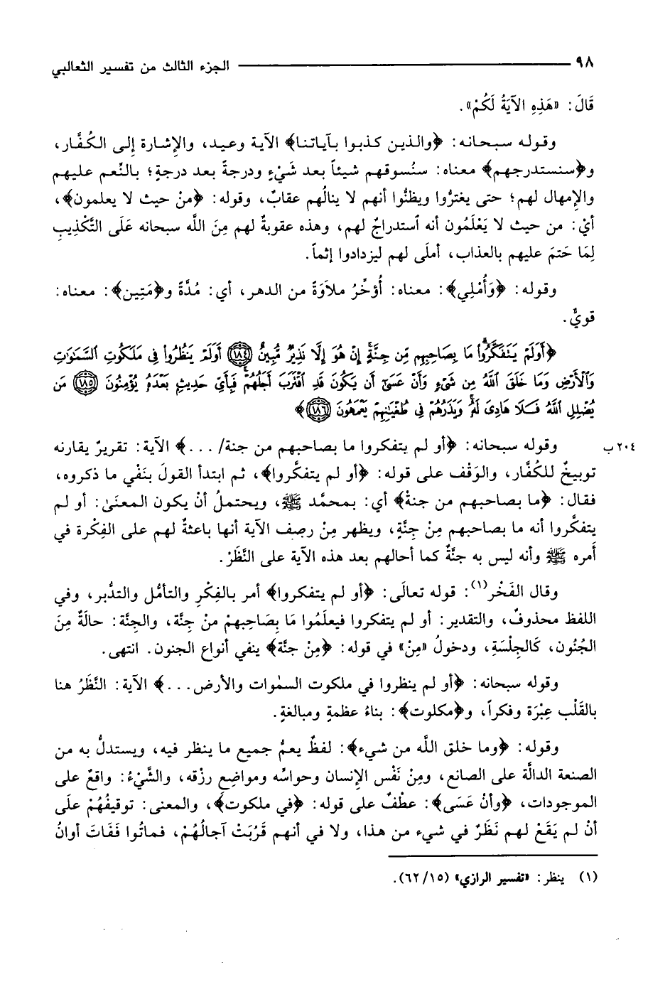 وقوله سبحانه: أَوَلَمْ يَتَفَكَّرُوا مَا بِصاحِبِهِمْ مِنْ جِنَّةٍ/ ... الآية: تقريرٌ يقارنه توبيخ للكفّار، والوقف على قوله: أَوَلَمْ يَتَفَكَّرُوا، ثم ابتدأ القولَ بنَفْي ما ذكروه، فقال: مَا بِصاحِبِهِمْ مِنْ جِنَّةٍ أي: بمحمَّد صلّى الله عليه وسلّم، ويحتملُ أنْ يكون المعنى: أو لم يتفكَّروا أنه ما بصاحبهم مِنْ جِنَّةٍ، ويظهر مِنْ رصف الآية أنها باعثةٌ لهم على الفِكْرة في أمره صلّى الله عليه وسلّم وأنه ليس به جنَّةٌ كما أحالهم بعد هذه الآية على النَّظَرْ.