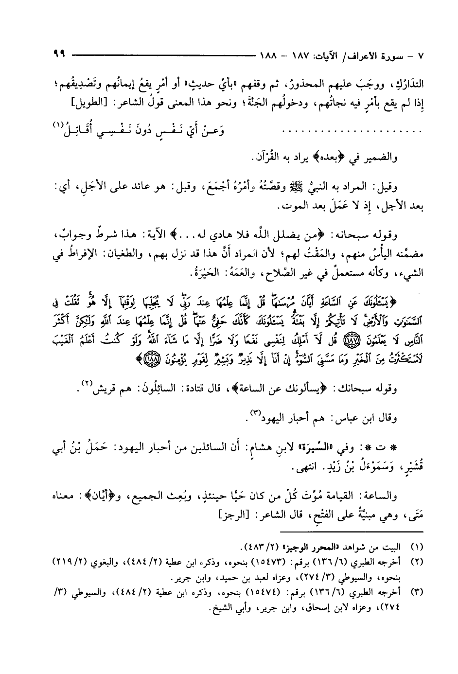 يَسْئَلُونَكَ عَنِ السَّاعَةِ أَيَّانَ مُرْساها قُلْ إِنَّما عِلْمُها عِنْدَ رَبِّي لا يُجَلِّيها لِوَقْتِها إِلاَّ هُوَ ثَقُلَتْ فِي السَّماواتِ وَالْأَرْضِ لا تَأْتِيكُمْ إِلاَّ بَغْتَةً يَسْئَلُونَكَ كَأَنَّكَ حَفِيٌّ عَنْها قُلْ إِنَّما عِلْمُها عِنْدَ اللَّهِ وَلكِنَّ أَكْثَرَ النَّاسِ لا يَعْلَمُونَ (187) قُلْ لاَّ أَمْلِكُ لِنَفْسِي نَفْعاً وَلا ضَرًّا إِلاَّ ما شاءَ اللَّهُ وَلَوْ كُنْتُ أَعْلَمُ الْغَيْبَ لاسْتَكْثَرْتُ مِنَ الْخَيْرِ وَما مَسَّنِيَ السُّوءُ إِنْ أَنَا إِلاَّ نَذِيرٌ وَبَشِيرٌ لِقَوْمٍ يُؤْمِنُونَ (188)