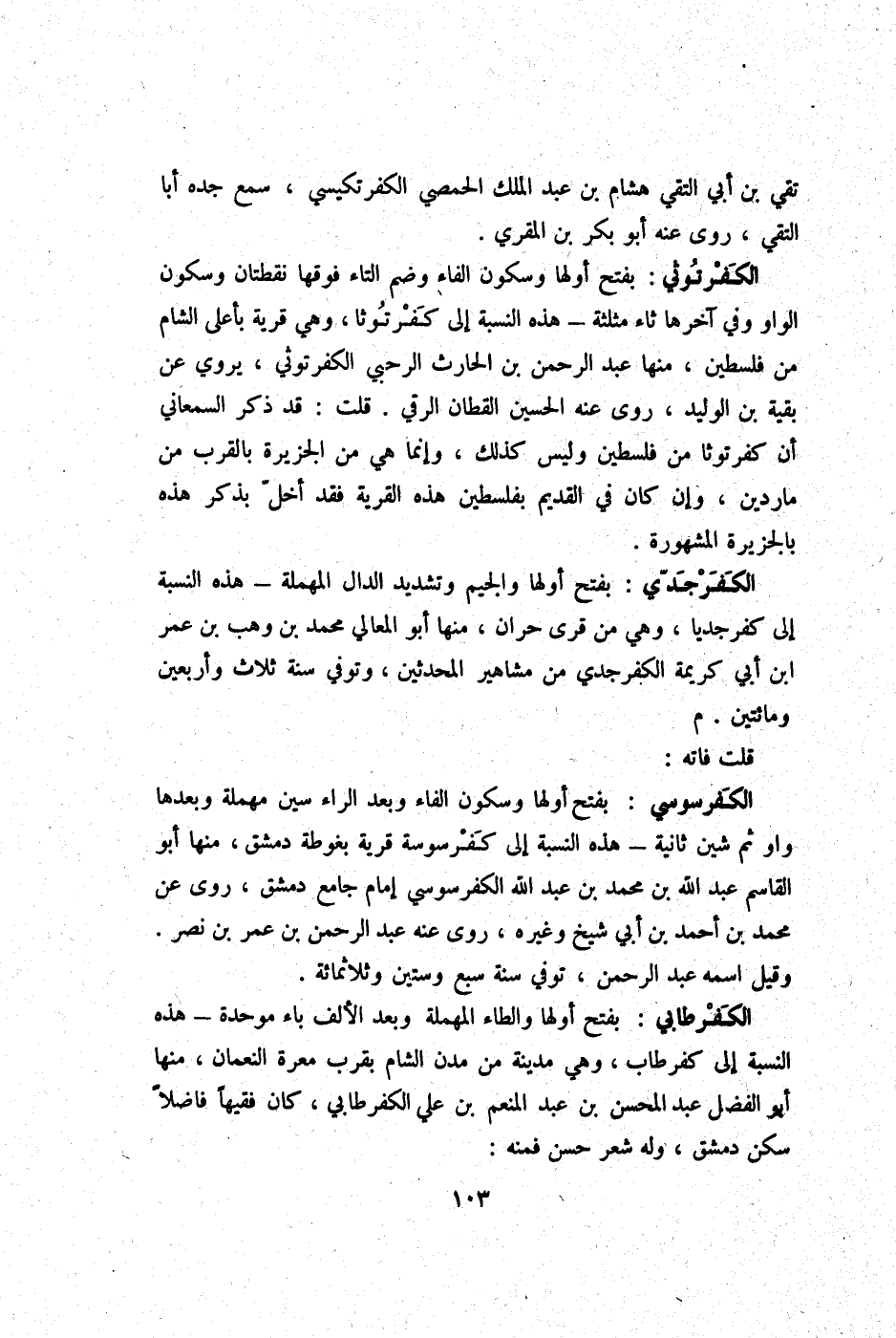 الكفرطابي بِفَتْح أَولهَا والطاء الْمُهْملَة وَبعد الْألف بَاء مُوَحدَة هَذِه النِّسْبَة إِلَى كفرطاب وَهِي مَدِينَة من مدن الشَّام بِقرب معرة النُّعْمَان مِنْهَا أَبُو الْفضل عبد المحسن بن عبد الْمُنعم بن عَليّ الكفرطابي كَانَ فَقِيها فَاضلا سكن دمشق وَله شعر حسن فَمِنْهُ