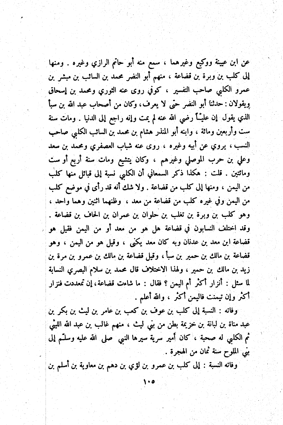 عَن ابْن عُيَيْنَة ووكيع وَغَيرهمَا سمع مِنْهُ أَبُو حَاتِم الرَّازِيّ وَغَيره وَمِنْهَا إِلَى كلب بن وبرة بن قضاعة مِنْهُم أَبُو النَّضر مُحَمَّد بن السَّائِب بن مُبشر بن عَمْرو الْكَلْبِيّ صَاحب التَّفْسِير كُوفِي روى عَنهُ الثَّوْريّ وَمُحَمّد بن اسحاق ويقولان حَدثنَا أَبُو النَّضر حَتَّى لَا يعرف وَكَانَ من أَصْحَاب عبد الله بن سبأ الَّذِي يَقُول إِن عليا رَضِي الله عَنهُ لم يمت وَإنَّهُ رَاجع إِلَى الدُّنْيَا وَمَات سنة سِتّ وَأَرْبَعين وَمِائَة وَابْنه أَبُو الْمُنْذر هِشَام بن مُحَمَّد بن السَّائِب الْكَلْبِيّ صَاحب النّسَب يروي عَن أَبِيه وَغَيره روى عَنهُ شباب الْعُصْفُرِي وَمُحَمّد بن سعد وَعلي بن حَرْب الْموصِلِي وَغَيرهم وَكَانَ يتشيع وَمَات سنة أَربع أَو سِتّ وَمِائَتَيْنِ قلت هَكَذَا ذكر السَّمْعَانِيّ أَن الْكَلْبِيّ نِسْبَة إِلَى قبائل مِنْهَا كلب من الْيمن وَمِنْهَا إِلَى كلب من قضاعة وَلَا شكّ أَنه قد رأى فِي مَوضِع كلب من الْيمن وَفِي غَيره كلب من قضاعة من معد وظنهما اثْنَيْنِ وهما وَاحِد وَهُوَ كلب بن وبرة بن تغلب بن حلوان بن عمرَان بن الحاف بن قضاعة وَقد اخْتلف النسابون فِي قضاعة هَل هُوَ من معد أَو من الْيمن فَقيل هُوَ قضاعة ابْن معد بن عدنان وَبِه كَانَ معد يكنى وَقيل هُوَ من الْيمن وَهُوَ قضاعة بن مَالك بن حمير بن سبأ وَقيل قضاعة بن مَالك بن عَمْرو بن مرّة بن زيد بن مَالك بن حمير وَلِهَذَا الِاخْتِلَاف قَالَ مُحَمَّد بن سَلام الْبَصْرِيّ النسابة لما سُئِلَ أنزار أَكثر أم الْيمن فَقَالَ مَا شَاءَت قضاعة إِن تمعددت فنزار أَكثر وَإِن تيمنت فاليمن أَكثر وَالله أعلم