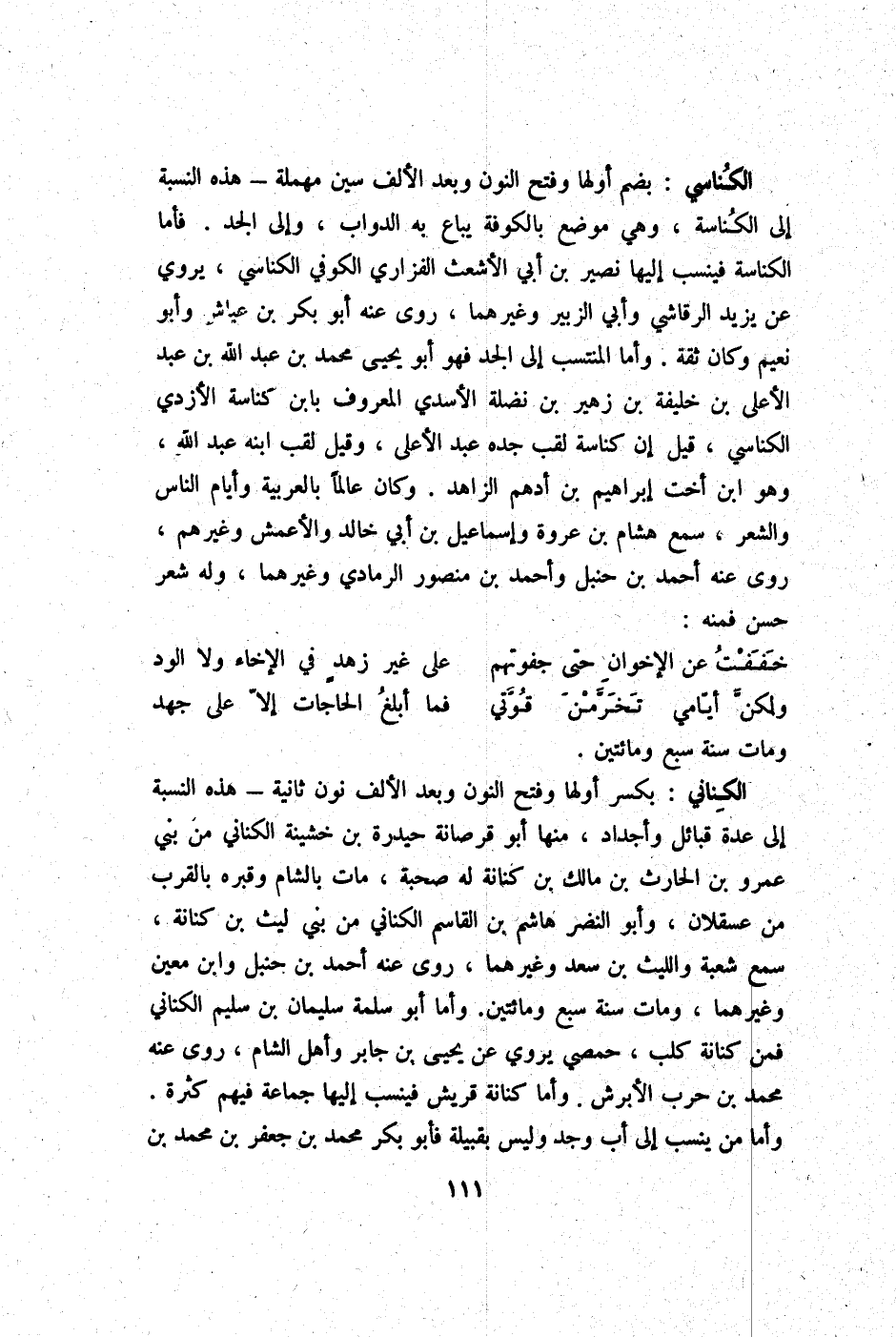 الكناسي بِضَم أَولهَا وَفتح النُّون وَبعد الْألف سين مُهْملَة هَذِه النِّسْبَة إِلَى الكناسة وَهِي مَوضِع بِالْكُوفَةِ يُبَاع بِهِ الدَّوَابّ وَإِلَى الْجد فَأَما الكناسة فينسب إِلَيْهَا نصير بن أبي الْأَشْعَث الْفَزارِيّ الْكُوفِي الكناسي يروي عَن يزِيد الرقاشِي وَأبي الزبير وَغَيرهمَا روى عَنهُ أَبُو بكر بن عَيَّاش وَأَبُو نعيم وَكَانَ ثِقَة وَأما المنتسب إِلَى الْجد فَهُوَ أَبُو يحيى مُحَمَّد بن عبد الله بن عبد الْأَعْلَى بن خَليفَة بن زُهَيْر بن نَضْلَة الْأَسدي الْمَعْرُوف بِابْن كناسَة الْأَزْدِيّ الكناسي قيل إِن كناسَة لقب جده عبد الْأَعْلَى وَقيل لقب ابْنه عبد الله وَهُوَ ابْن أُخْت إِبْرَاهِيم بن أدهم الزَّاهِد وَكَانَ عَالما بِالْعَرَبِيَّةِ وَأَيَّام النَّاس وَالشعر سمع هِشَام بن عُرْوَة وَإِسْمَاعِيل بن أبي خَالِد وَالْأَعْمَش وَغَيرهم روى عَنهُ أَحْمد بن حَنْبَل وَأحمد بن مَنْصُور الرَّمَادِي وَغَيرهمَا وَله شعر حسن فَمِنْهُ