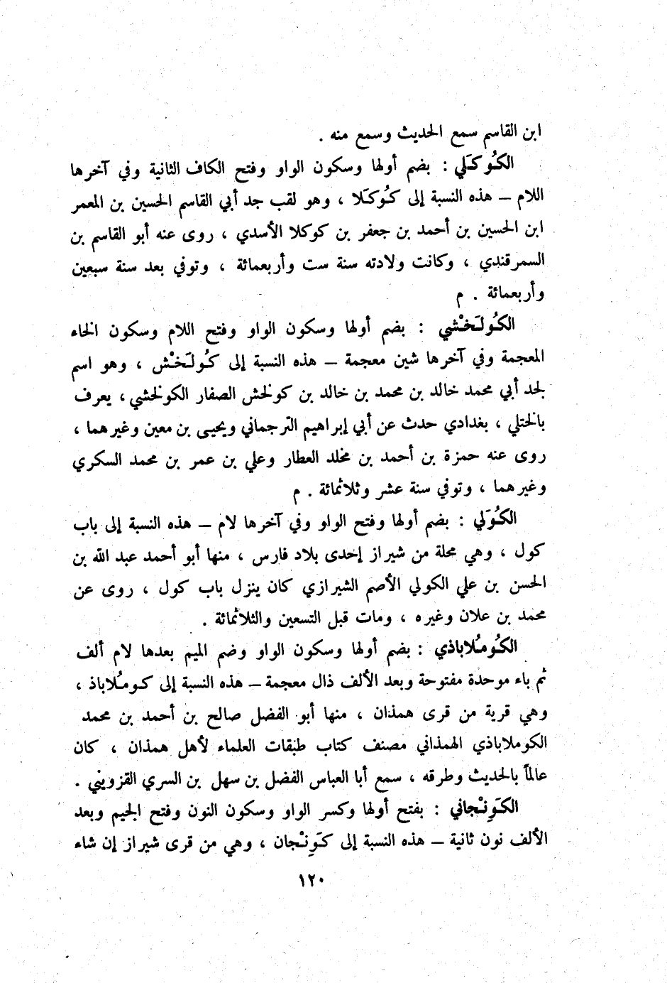 الكوكلي بِضَم أَولهَا وَسُكُون الْوَاو وَفتح الْكَاف الثَّانِيَة وَفِي آخرهَا اللَّام هَذِه النِّسْبَة إِلَى كوكلا وَهُوَ لقب جد أبي الْقَاسِم الْحُسَيْن بن المعمر ابْن الْحُسَيْن بن أَحْمد بن جَعْفَر بن كوكلا الْأَسدي روى عَنهُ أَبُو الْقَاسِم بن السَّمرقَنْدِي وَكَانَت وِلَادَته سنة سِتّ وَأَرْبَعمِائَة وَتُوفِّي بعد سنة سبعين وَأَرْبَعمِائَة م