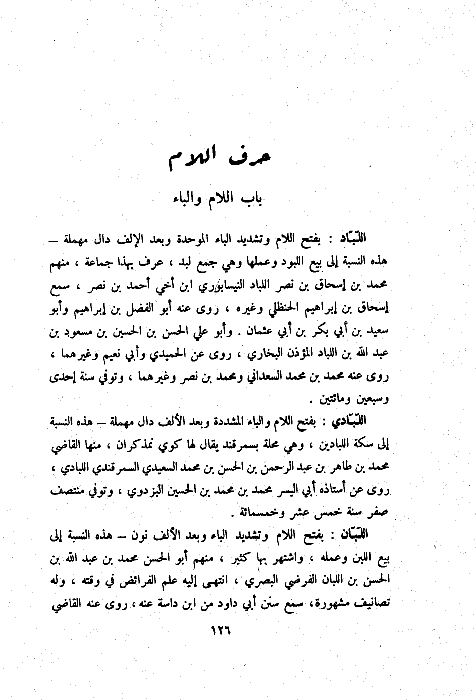 اللبان بِفَتْح اللَّام وَتَشْديد الْبَاء وَبعد الْألف نون هَذِه النِّسْبَة إِلَى بيع اللَّبن وَعَمله واشتهر بهَا كثير مِنْهَا أَبُو الْحسن مُحَمَّد بن عبد الله بن الْحسن بن اللبان الفرضي الْبَصْرِيّ انْتهى إِلَيْهِ علم الْفَرَائِض فِي وقته وَله تصانيف مَشْهُورَة سمع سنَن أبي دَاوُد من ابْن داسة عَنهُ روى عَنهُ القَاضِي