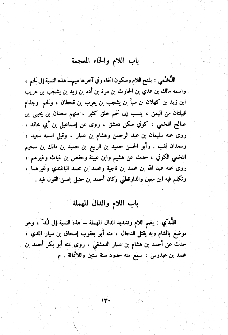 اللَّخْمِيّ بِفَتْح اللَّام وَسُكُون الْخَاء وَفِي آخرهَا مِيم هَذِه النِّسْبَة إِلَى لخم واسْمه مَالك بن عدي بن الْحَارِث بن مرّة بن أدد بن زيد بن يشجب بن عريب ابْن زيد بن كهلان بن سبأ بن يشجب بن يعرب بن قحطان ولخم وجذام قبيلتان من الْيمن ينْسب إِلَى لخم خلق كثير مِنْهُم سَعْدَان بن يحيى بن صَالح اللَّخْمِيّ كُوفِي سكن دمشق روى عَن إِسْمَاعِيل بن أبي خَالِد روى عَنهُ سُلَيْمَان بن عبد الرَّحْمَن وَهِشَام بن عمار وَقيل اسْمه سعيد وسعدان لقب وَأَبُو الْحسن حميد بن الرّبيع بن حميد بن مَالك بن سحيم اللَّخْمِيّ الْكُوفِي حدث عَن هشيم وَابْن عُيَيْنَة وَحَفْص بن غياث وَغَيرهم روى عَنهُ عبد الله بن مُحَمَّد بن نَاجِية وَمُحَمّد بن مُحَمَّد الباغندي وَغَيرهمَا وَتكلم فِيهِ ابْن معِين وَالدَّارَقُطْنِيّ وَكَانَ أَحْمد بن حَنْبَل يحسن القَوْل فِيهِ