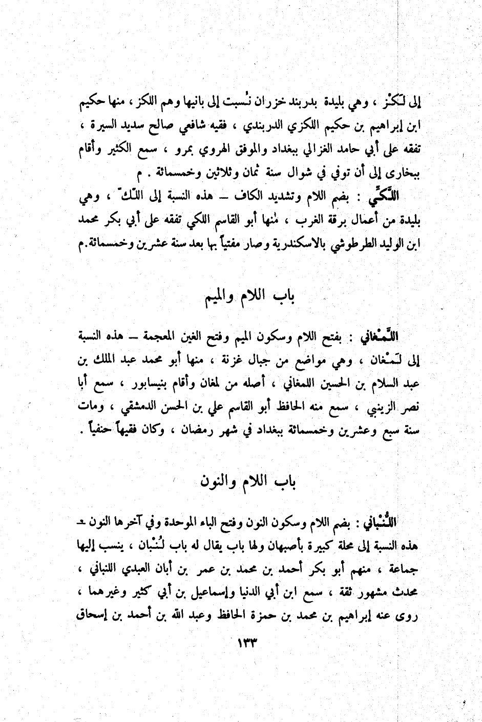 اللمغاني بِفَتْح اللَّام وَسُكُون الْمِيم وَفتح الْغَيْن الْمُعْجَمَة هَذِه النِّسْبَة إِلَى لمغان وَهِي مَوَاضِع من جبال غزنة مِنْهَا أَبُو مُحَمَّد عبد الْملك بن عبد السَّلَام بن الْحُسَيْن اللمغاني أَصله من لمغان وَأقَام بنيسابور سمع أَبَا نصر الزَّيْنَبِي سمع مِنْهَا الْحَافِظ أَبُو الْقَاسِم عَليّ بن الْحسن الدِّمَشْقِي وَمَات سنة سبع وَعشْرين وَخَمْسمِائة بِبَغْدَاد فِي شهر رَمَضَان وَكَانَ فَقِيها حنفيا