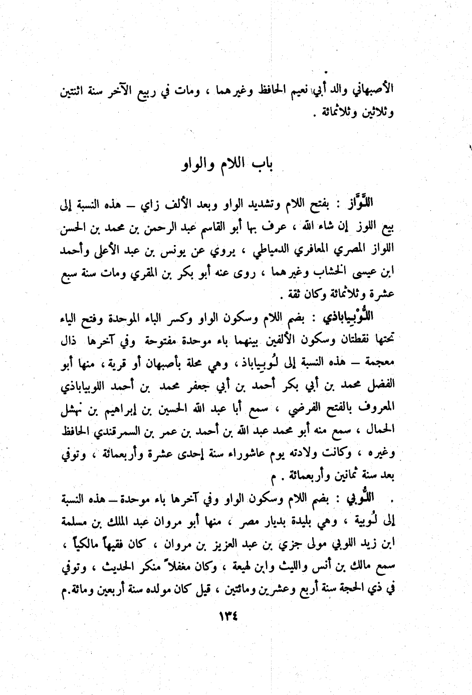 اللوبياباذي بِضَم اللَّام وَسُكُون الْوَاو وَكسر الْبَاء الْمُوَحدَة وَفتح الْيَاء تحتهَا نقطتان وَسُكُون الْأَلفَيْنِ بَينهمَا بَاء مُوَحدَة مَفْتُوحَة وَفِي آخرهَا ذال مُعْجمَة هَذِه النِّسْبَة إِلَى لوبياباذ وَهِي محلّة بأصبهان أَو قَرْيَة مِنْهَا أَبُو الْفضل مُحَمَّد بن أبي بكر أَحْمد بن أبي جَعْفَر مُحَمَّد بن أَحْمد اللوبياباذي الْمَعْرُوف بِالْفَتْح الفرضي سمع أَبَا عبد الله الْحُسَيْن بن إِبْرَاهِيم بن نهشل الْحمال سمع مِنْهُ أَبُو مُحَمَّد عبد الله بن أَحْمد بن عمر بن السَّمرقَنْدِي الْحَافِظ وَغَيره وَكَانَت وِلَادَته يَوْم عَاشُورَاء سنة إِحْدَى عشرَة وَأَرْبَعمِائَة وَتُوفِّي بعد سنة ثَمَانِينَ وَأَرْبَعمِائَة م