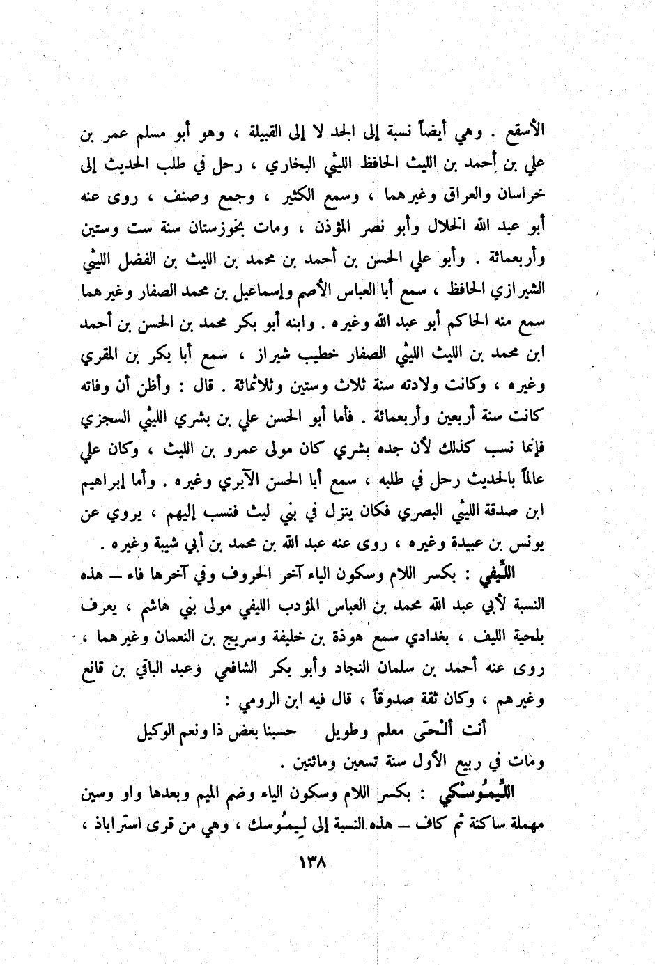 الْأَسْقَع وَهِي أَيْضا نِسْبَة إِلَى الْجد لَا إِلَى الْقَبِيلَة وَهُوَ أَبُو مُسلم عمر بن عَليّ بن أَحْمد بن اللَّيْث الْحَافِظ اللَّيْثِيّ البُخَارِيّ رَحل فِي طلب الحَدِيث إِلَى خُرَاسَان وَالْعراق وَغَيرهمَا وَسمع الْكثير وَجمع وصنف روى عَنهُ أَبُو عبد الله الْخلال وَأَبُو نصر الْمُؤَذّن وَمَات بخوزستان سنة سِتّ وَسِتِّينَ وَأَرْبَعمِائَة وَأَبُو عَليّ الْحسن بن أَحْمد بن مُحَمَّد بن اللَّيْث بن الْفضل اللَّيْثِيّ الشِّيرَازِيّ الْحَافِظ سمع أَبَا الْعَبَّاس الْأَصَم وَإِسْمَاعِيل بن مُحَمَّد الصفار وَغَيرهمَا سمع مِنْهُ الْحَاكِم أَبُو عبد الله وَغَيره وَابْنه أَبُو بكر مُحَمَّد بن الْحسن بن أَحْمد ابْن مُحَمَّد بن اللَّيْث اللَّيْثِيّ الصفار خطيب شيراز سمع أَبَا بكر بن الْمقري وَغَيره وَكَانَت وِلَادَته سنة ثَلَاث وَسِتِّينَ وثلاثمائة قَالَ وأظن أَن وَفَاته كَانَت سنة أَرْبَعِينَ وَأَرْبَعمِائَة فَأَما أَبُو الْحسن عَليّ بن بشري اللَّيْثِيّ السجْزِي فَإِنَّمَا نسب كَذَلِك لِأَن جده بشري كَانَ مولى عَمْرو بن اللَّيْث وَكَانَ عَليّ عَالما بِالْحَدِيثِ رَحل فِي طلبه سمع أَبَا الْحسن الآبري وَغَيره وَأما إِبْرَاهِيم ابْن صَدَقَة اللَّيْثِيّ الْبَصْرِيّ فَكَانَ ينزل فِي بني لَيْث فنسب إِلَيْهِم يروي عَن يُونُس بن عُبَيْدَة وَغَيره روى عَنهُ عبد الله بن مُحَمَّد بن أبي شيبَة وَغَيره