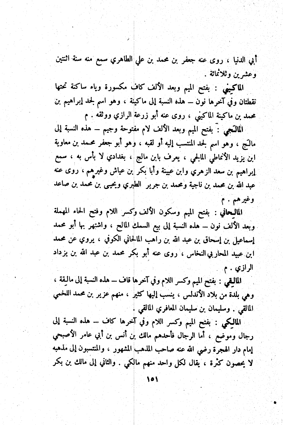 الْمَالِكِي بِفَتْح الْمِيم وَكسر اللَّام وَفِي آخرهَا كَاف هَذِه النِّسْبَة إِلَى رجال وَمَوْضِع أما الرِّجَال فأحدهم مَالك بن أنس بن أبي عَامر الأصبحي إِمَام دَار الْهِجْرَة رَضِي الله عَنهُ صَاحب الْمَذْهَب الْمَشْهُور والمنتسبون إِلَى مذْهبه لَا يُحصونَ كَثْرَة يُقَال لكل وَاحِد مِنْهُم مالكي وَالثَّانِي إِلَى مَالك بن بكر