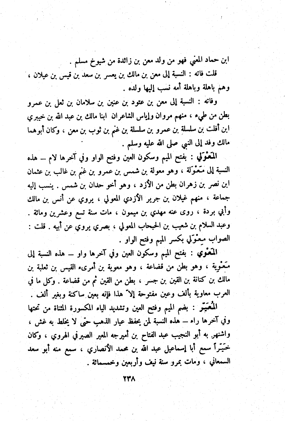 قلت فَاتَهُ النِّسْبَة إِلَى معن بن مَالك بن يعسر بن سعد بن قيس بن عيلان وهم باهلة وباهلة امهِ نسب إِلَيْهَا وَلَده