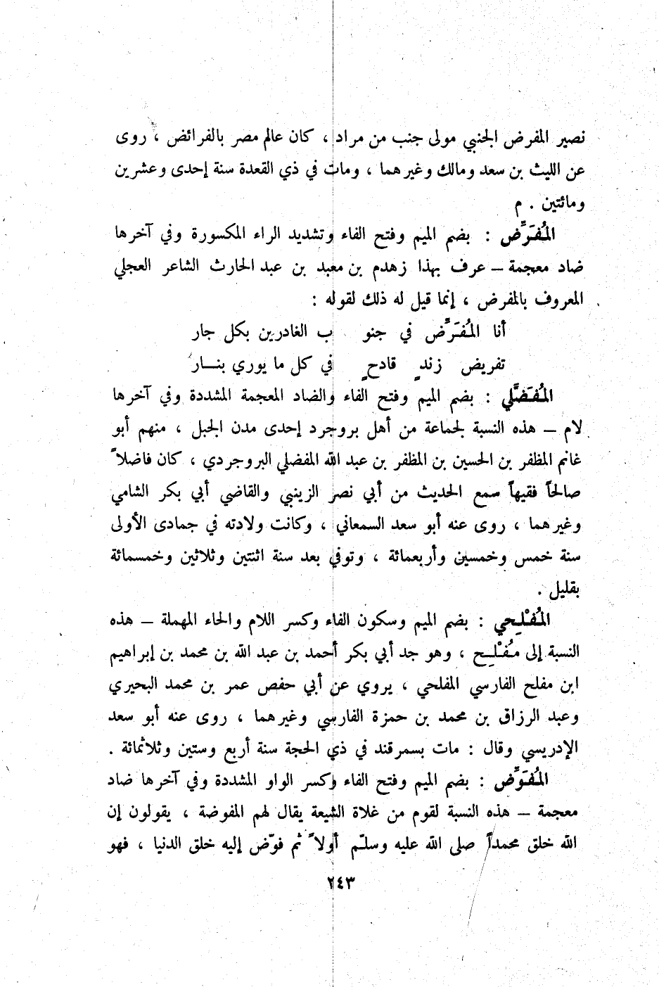 الْمُفَوض بِضَم الْمِيم وَفتح الْفَاء وَكسر الْوَاو الْمُشَدّدَة وَفِي آخرهَا ضاد مُعْجمَة هَذِه النِّسْبَة لقوم من غلاة الشِّيعَة يُقَال لَهُم المفوضة يَقُولُونَ إِن الله خلق مُحَمَّدًا صلى الله عَلَيْهِ وَسلم أَولا ثمَّ فوض إِلَيْهِ خلق الدِّينَا فَهُوَ