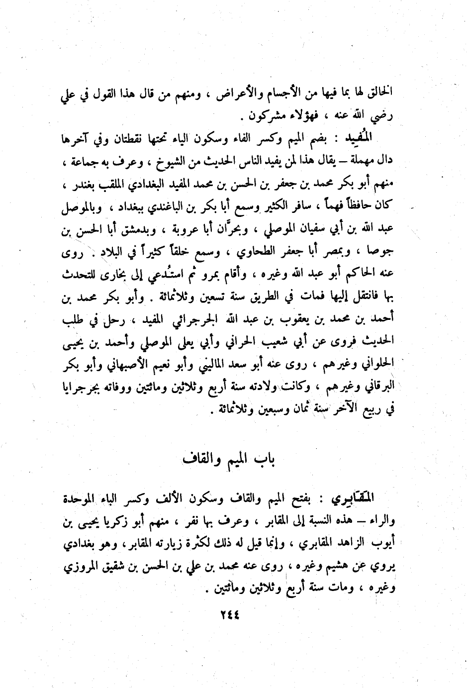 الْمُفِيد بِضَم الْمِيم وَكسر الْفَاء وَسُكُون الْيَاء تحتهَا نقطتان وَفِي آخرهَا دَال مُهْملَة يُقَال هَذَا لمن يُفِيد النَّاس الحَدِيث من الشُّيُوخ وَعرف بِهِ جمَاعَة مِنْهُم أَبُو بكر مُحَمَّد بن جَعْفَر بن الْحسن بن مُحَمَّد الْمُفِيد الْبَغْدَادِيّ الملقب بغندر كَانَ حَافِظًا فهما سَافر الْكثير وَسمع أَبَا بكر بن الباغندي بِبَغْدَاد وبالموصل عبد الله بن أبي سُفْيَان الْموصِلِي وبحران أَبَا عرُوبَة وبدمشق ابا الْحسن بن جوصا وبمصر أَبَا جَعْفَر الطَّحَاوِيّ وَسمع خلقا كثيرا فِي الْبِلَاد روى عَنهُ الْحَاكِم أَبُو عبد الله وَغَيره وَأقَام بمرو ثمَّ استدعي إِلَى بُخَارى للتحدث بهَا فانتقل إِلَيْهَا فَمَاتَ فِي الطَّرِيق سنة تسعين وثلاثمائة وابو بكر مُحَمَّد بن أَحْمد بن مُحَمَّد بن يَعْقُوب بن عبد الله الجرجرائي الْمُفِيد رَحل فِي طلب الحَدِيث فروى عَن أبي شُعَيْب الْحَرَّانِي وَأبي يعلى الْموصِلِي وَأحمد بن يحيى الْحلْوانِي وَغَيرهم روى عَنهُ أَبُو سعد الْمَالِينِي وَأَبُو نعيم الْأَصْبَهَانِيّ وَأَبُو بكر البرقاني وَغَيرهم وَكَانَت وِلَادَته سنة أَربع وَثَلَاثِينَ وَمِائَتَيْنِ ووفاته بجرجرايا فِي ربيع الآخر سنة ثَمَان وَسبعين وثلاثمائة