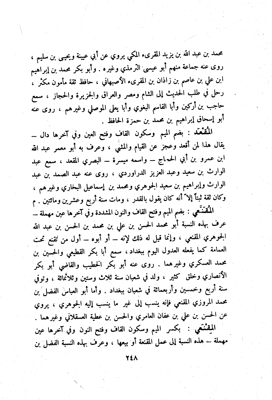 مُحَمَّد بن عبد الله بن يزِيد الْمُقْرِئ الْمَكِّيّ يروي عَن أبي عُيَيْنَة وَيحيى بن سليم روى عَنهُ جمَاعَة مِنْهُم أَبُو عِيسَى التِّرْمِذِيّ وَغَيره وَأَبُو بكر مُحَمَّد بن إِبْرَاهِيم ابْن عَليّ بن عَاصِم بن زَاذَان بن الْمُقْرِئ الْأَصْبَهَانِيّ حَافظ ثِقَة مَأْمُون مكثر رَحل فِي طلب الحَدِيث إِلَى الشَّام ومصر وَالْعراق والجزيرة والحجاز سمع حَاجِب بن أركين وَأَبا الْقَاسِم الْبَغَوِيّ وابا يعلى الْموصِلِي وَغَيرهم روى عَنهُ أَبُو اسحاق إِبْرَاهِيم بن مُحَمَّد بن حَمْزَة الْحَافِظ