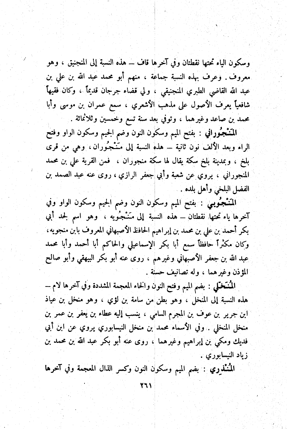 وَسُكُون الْيَاء تحتهَا نقطتان وَفِي آخرهَا قَاف هَذِه النِّسْبَة إِلَى المنجنيق وَهُوَ مَعْرُوف وَعرف بِهَذِهِ النِّسْبَة جمَاعَة مِنْهُم أَبُو مُحَمَّد عبد الله بن عَليّ بن عبد الله القَاضِي الطَّبَرِيّ المنجنيقي ولي قَضَاء جرجان قَدِيما وَكَانَ فَقِيها شافعيا يعرف الْأُصُول على مَذْهَب الْأَشْعَرِيّ سمع عمرَان بن مُوسَى وَأَبا مُحَمَّد بن صاعد وَغَيرهمَا وَتُوفِّي بعد سنة تسع وَخمسين وثلاثمائة