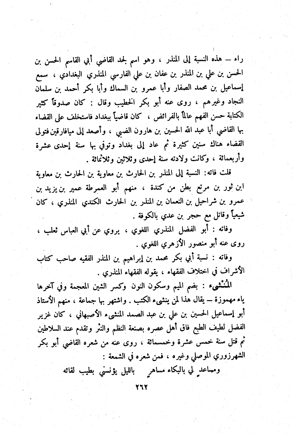 وَفَاته نِسْبَة أبي بكر مُحَمَّد بن إِبْرَاهِيم بن الْمُنْذر الْفَقِيه صَاحب كتاب الْأَشْرَاف فِي اخْتِلَاف الْفُقَهَاء يَقُوله الْفُقَهَاء الْمُنْذِرِيّ