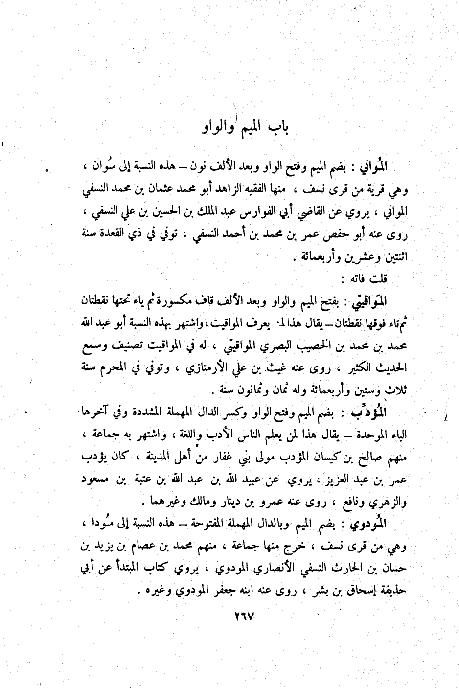 المواني بِضَم الْمِيم وَفتح الْوَاو وَبعد الْألف نون هَذِه النِّسْبَة إِلَى موان وَهِي قَرْيَة من قرى نسف مِنْهَا الْفَقِيه الزَّاهِد أَبُو مُحَمَّد عُثْمَان بن مُحَمَّد النَّسَفِيّ المواني يروي عَن القَاضِي أبي الفوارس عبد الْملك بن الْحُسَيْن بن عَليّ النَّسَفِيّ روى عَنهُ أَبُو حَفْص عمر بن مُحَمَّد بن أَحْمد النَّسَفِيّ توفّي فِي ذِي الْقعدَة سنة اثْنَتَيْنِ وَعشْرين وَأَرْبَعمِائَة