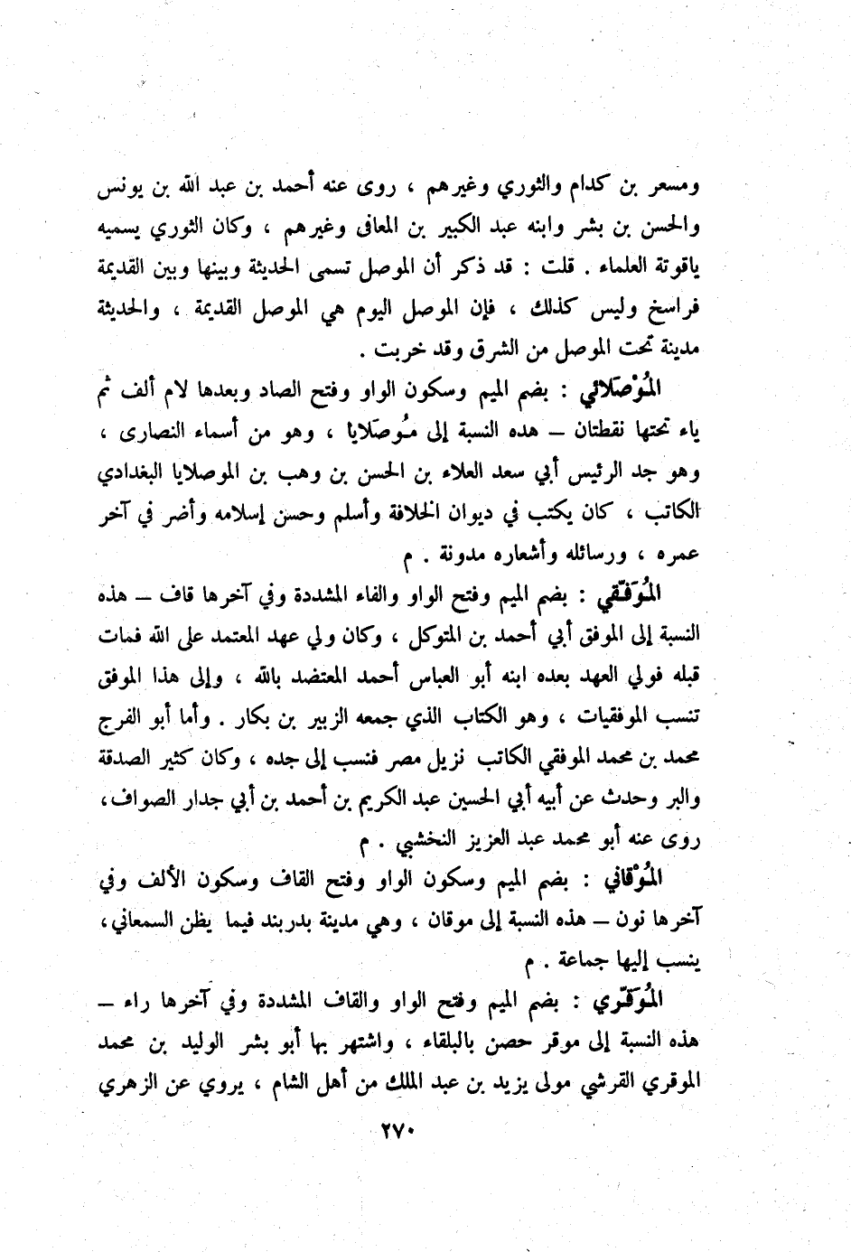 الموفقي بِضَم الْمِيم وَفتح الْوَاو وَالْفَاء الْمُشَدّدَة وَفِي آخرهَا قَاف هَذِه النِّسْبَة إِلَى الْمُوفق ابي أَحْمد بن المتَوَكل وَكَانَ ولي عهد الْمُعْتَمد على الله فَمَاتَ قبله فولي الْعَهْد بعهده ابْنه أَبُو الْعَبَّاس أَحْمد المعتضد بِاللَّه وَإِلَى هَذَا الْمُوفق تنْسب الموفقيات وَهُوَ الْكتاب الَّذِي جمعه الزبير بن بكار وَأما أَبُو الْفرج مُحَمَّد بن مُحَمَّد الموفقي الْكَاتِب نزيل مصر فنسب إِلَى جده وَكَانَ كثير الصَّدَقَة وَالْبر وَحدث عَن أَبِيه أبي الْحُسَيْن عبد الْكَرِيم بن أَحْمد بن أبي جِدَار الصَّواف روى عَنهُ أَبُو مُحَمَّد عبد الْعَزِيز النخشبي م