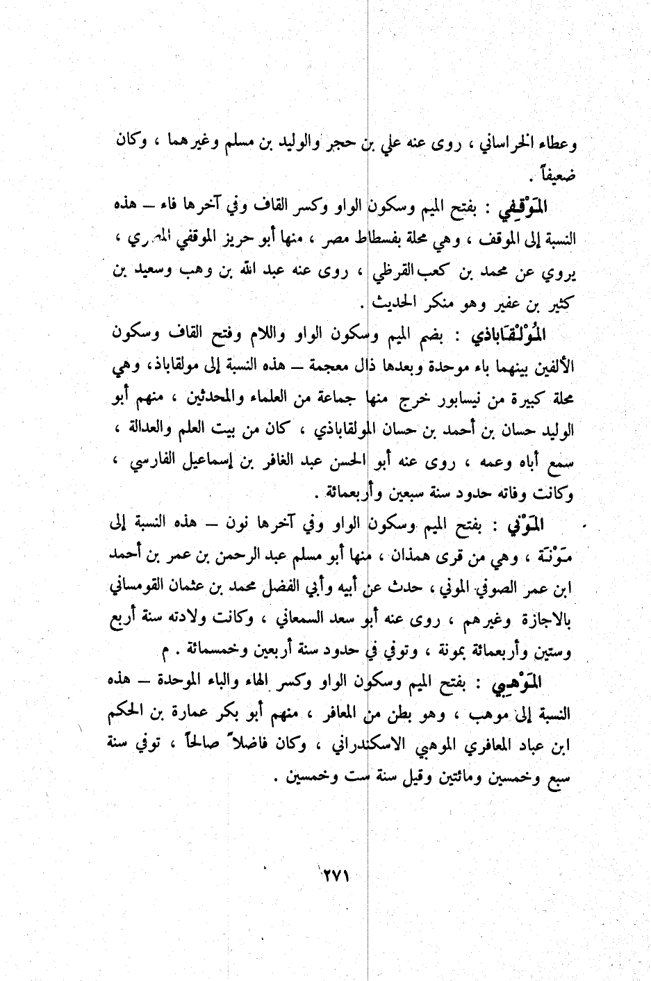المولقاباذي بِضَم الْمِيم وَسُكُون الْوَاو وَاللَّام وَفتح الْقَاف وَسُكُون الْأَلفَيْنِ بَينهمَا بَاء مُوَحدَة وَبعدهَا ذال مُعْجمَة هَذِه النِّسْبَة إِلَى مولقاباذ وَهِي محلّة كَبِيرَة من نيسابور خرج مِنْهَا جمَاعَة من الْعلمَاء والمحدثين مِنْهُم أَبُو الْوَلِيد حسان بن أَحْمد بن حسان المولقاباذي كَانَ من بَيت الْعلم وَالْعَدَالَة سمع أَبَاهُ وَعَمه روى عَنهُ أَبُو الْحسن عبد الغافر بن إِسْمَاعِيل الْفَارِسِي وَكَانَت وَفَاته حُدُود سنة سبعين واربعمائة