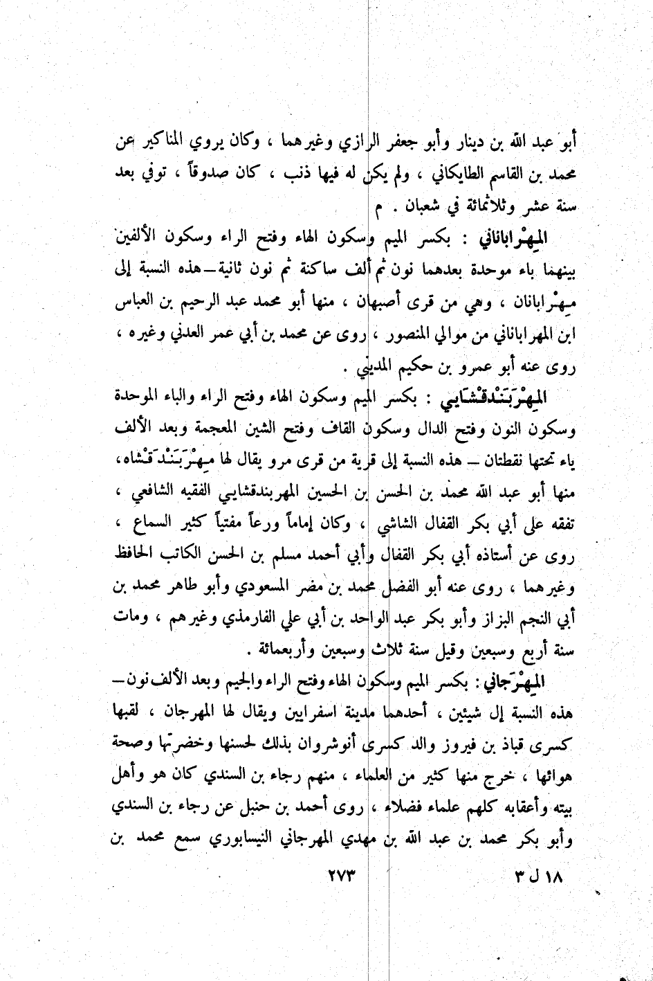 المهرجاني بِكَسْر الْمِيم وَسُكُون الْهَاء وَفتح الرَّاء وَالْجِيم وَبعد الْألف نون هَذِه النِّسْبَة إِلَى شَيْئَيْنِ أَحدهمَا مَدِينَة اسفرايين وَيُقَال لَهَا المهرجان لقبها كسْرَى قباذ بن فَيْرُوز وَالِد كسْرَى أنوشروان بذلك لحسنها وخضرتها وَصِحَّة هوائها خرج مِنْهَا كثير من الْعلمَاء مِنْهُم رَجَاء بن السندي كَانَ هُوَ وَأهل بَيته وأعقباه كلهم عُلَمَاء فضلاء روى أَحْمد بن حَنْبَل عَن رَجَاء بن السندي وَأَبُو بكر مُحَمَّد بن عبد الله بن مهْدي المهرجاني النَّيْسَابُورِي سمع مُحَمَّد بن
