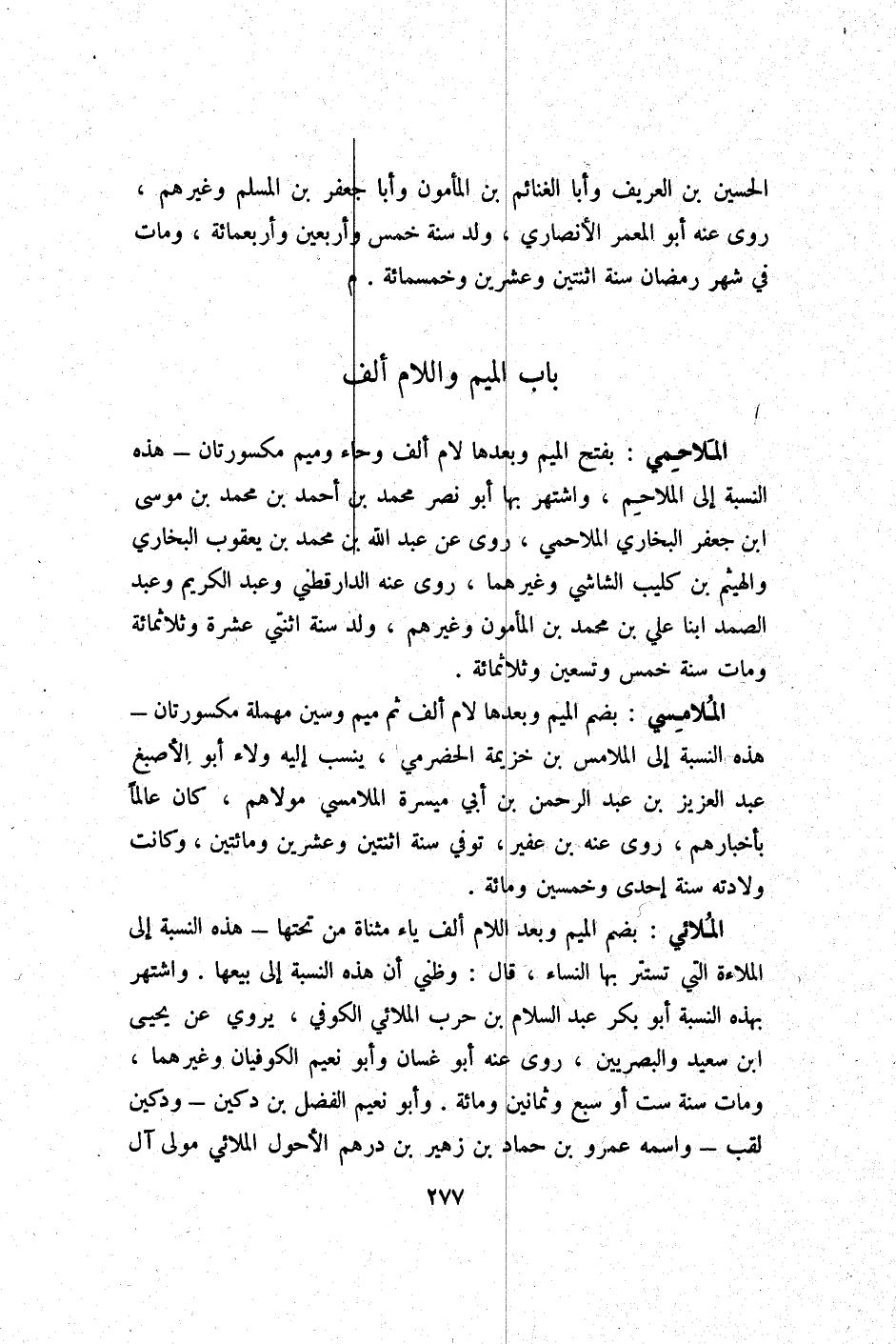 الْملَائي بِضَم الْمِيم وَبعد اللَّام ألف يَاء مثناة من تحتهَا هَذِه النِّسْبَة إِلَى الملاءة الَّتِي تستتر بهَا النِّسَاء قَالَ وظني أَن هَذِه النِّسْبَة إِلَى بيعهَا واشتهر بِهَذِهِ النِّسْبَة أَبُو بكر عبد السَّلَام بن حَرْب الْملَائي الْكُوفِي يروي عَن يحيى ابْن سعيد والبصريين روى عَنهُ أَبُو غَسَّان وَأَبُو نعيم الكوفيان وَغَيرهمَا وَمَات سنة سِتّ أَو سبع وَثَمَانِينَ وَمِائَة وَأَبُو نعيم الْفضل بن دُكَيْن ودكين لقب واسْمه عَمْرو بن حَمَّاد بن زُهَيْر بن دِرْهَم الْأَحول الْملَائي مولى آل