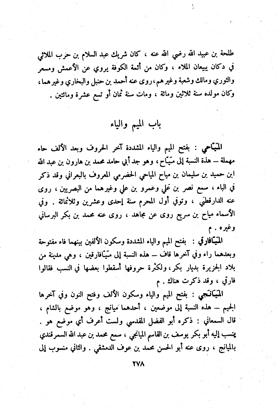 المياحي بِفَتْح الْمِيم وَالْيَاء الْمُشَدّدَة آخر الْحُرُوف وَبعد الْألف حاء مُهْملَة هَذِه النِّسْبَة إِلَى مياح وَهُوَ جد أبي حَامِد مُحَمَّد بن هَارُون بن عبد الله ابْن حميد بن سُلَيْمَان بن مياح المياحي الْحَضْرَمِيّ الْمَعْرُوف بالبعراني وَقد ذكر فِي الْبَاء سمع نصر بن عَليّ وَعَمْرو بن عَليّ وَغَيرهمَا من الْبَصرِيين روى عَنهُ الدَّارَقُطْنِيّ وَتُوفِّي أول الْمحرم سنة احدى وَعشْرين وثلاثمائة وَفِي الاسماء مياح بن سريع روى عَن مُجَاهِد روى عَنهُ مُحَمَّد بن بكر البرْسَانِي وَغَيره م