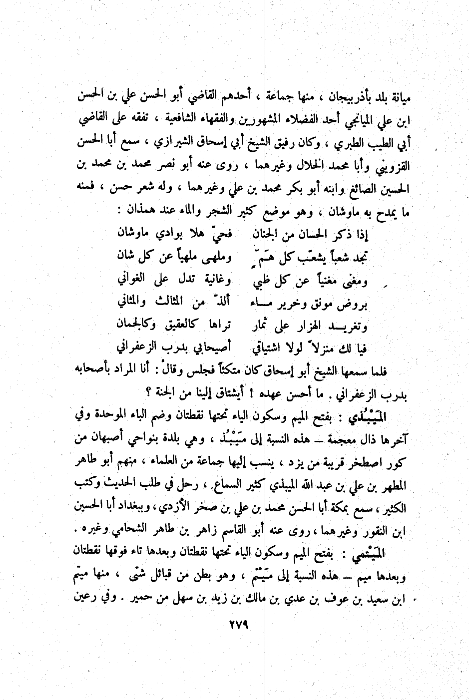 ميانة بلد بِأَذربِيجَان مِنْهَا جمَاعَة أحدهم القَاضِي أَبُو الْحسن عَليّ بن الْحسن ابْن عَليّ الميانجي اُحْدُ الْفُضَلَاء الْمَشْهُورين وَالْفُقَهَاء الشَّافِعِيَّة تفقه على القَاضِي أبي الطّيب الطَّبَرِيّ وَكَانَ رَفِيق الشَّيْخ أبي اسحاق الشِّيرَازِيّ سمع أَبَا الْحسن الْقزْوِينِي وابا مُحَمَّد الْخلال وَغَيرهمَا روى عَنهُ أَبُو نصر مُحَمَّد بن مُحَمَّد بن الْحُسَيْن الصَّائِغ وَابْنه ابو بكر مُحَمَّد بن عَليّ وَغَيرهمَا وَله شعر حسن فَمِنْهُ مَا يمدح بِهِ ماوشان وَهُوَ مَوضِع كثير الشّجر وَالْمَاء عِنْد همذان