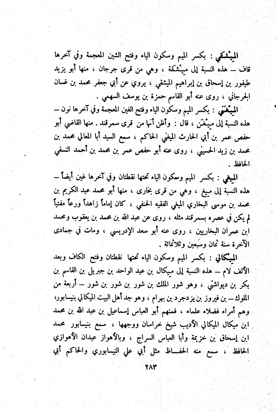 الميغني بِكَسْر الْمِيم وَسُكُون الْيَاء وَفتح الْغَيْن الْمُعْجَمَة وَفِي آخرهَا نون هَذِه النِّسْبَة إِلَى ميغن قَالَ وأظن أَنَّهَا من قرى سَمَرْقَنْد مِنْهَا القَاضِي أَبُو حَفْص عمر بن أبي الْحَارِث الميغني الْحَاكِم سمع السَّيِّد أَبَا الْمَعَالِي مُحَمَّد بن مُحَمَّد بن زيد الْحُسَيْنِي روى عَنهُ أَبُو حَفْص عمر بن مُحَمَّد بن أَحْمد النَّسَفِيّ الْحَافِظ