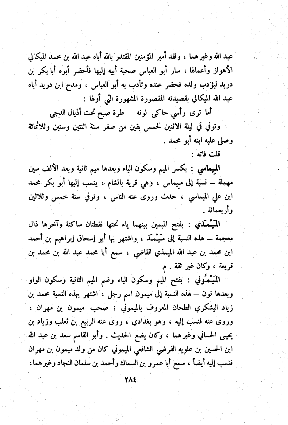 الميماسي بِكَسْر الْمِيم وَسُكُون الْيَاء وَبعدهَا مِيم ثَانِيَة وَبعد الْألف سين مُهْملَة نِسْبَة إِلَى ميماس وَهِي قَرْيَة بِالشَّام ينْسب إِلَيْهَا أَبُو بكر مُحَمَّد ابْن عَليّ الميماسي حدث وروى عَنهُ النَّاس وَتُوفِّي سنة خمس وَثَلَاثِينَ وَأَرْبَعين وَأَرْبَعمِائَة