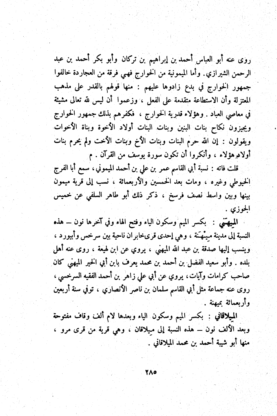 روى عَنهُ أَبُو الْعَبَّاس أَحْمد بن إِبْرَاهِيم بن ترْكَان وَأَبُو بكر أَحْمد بن عبد الرَّحْمَن الشِّيرَازِيّ وَأما الميمونية من الْخَوَارِج فَهِيَ فرقة من العجاردة خالفوا جُمْهُور الخوراج فِي بدع زادوها عَلَيْهِم مِنْهَا قَوْلهم بِالْقدرِ على مَذْهَب الْمُعْتَزلَة وَأَن الِاسْتِطَاعَة مُتَقَدّمَة على الْفِعْل وَزَعَمُوا أَن لَيْسَ لله تَعَالَى مَشِيئَة فِي معاصي الْعباد وَهَؤُلَاء قدرية الْخَوَارِج فكفرهم بذلك جُمْهُور الْخَوَارِج ويجيزون نِكَاح بَنَات الْبَنِينَ وَبَنَات الْبَنَات أَوْلَاد الْأُخوة وَبَنَات الْأَخَوَات وَيَقُولُونَ إِن الله حرم الْبَنَات وَبَنَات الْأَخ وَبَنَات الْأُخْت وَلم يحرم بَنَات أَوْلَاد هَؤُلَاءِ وأنكروا أَن تكون سُورَة يُوسُف من الْقُرْآن م