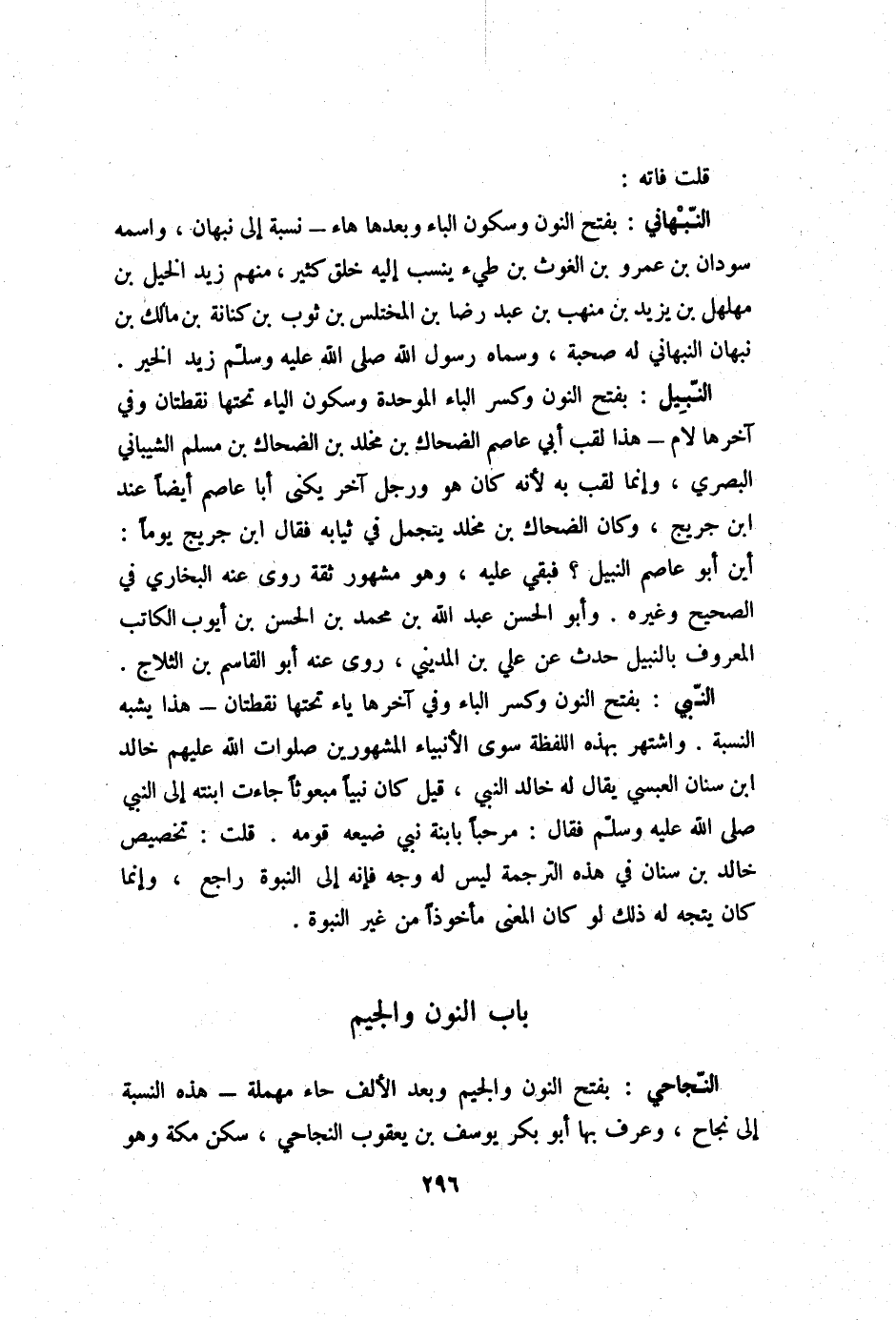 النبهاني بِفَتْح النُّون وَسُكُون الْبَاء وَبعدهَا هَاء نِسْبَة إِلَى نَبهَان واسْمه سودان بن عَمْرو بن الْغَوْث بن طَيء ينْسب إِلَيْهِ خلق كثير مِنْهُم زيد الْخَيل بن مهلهل بن يزِيد بن منْهب بن عبد رضَا بن المختلس بن ثوب بن كنَانَة بن مَالك بن نَبهَان النبهاني لَهُ صُحْبَة وَسَماهُ رَسُول الله صلى الله عَلَيْهِ وَسلم زيد الْخَيْر