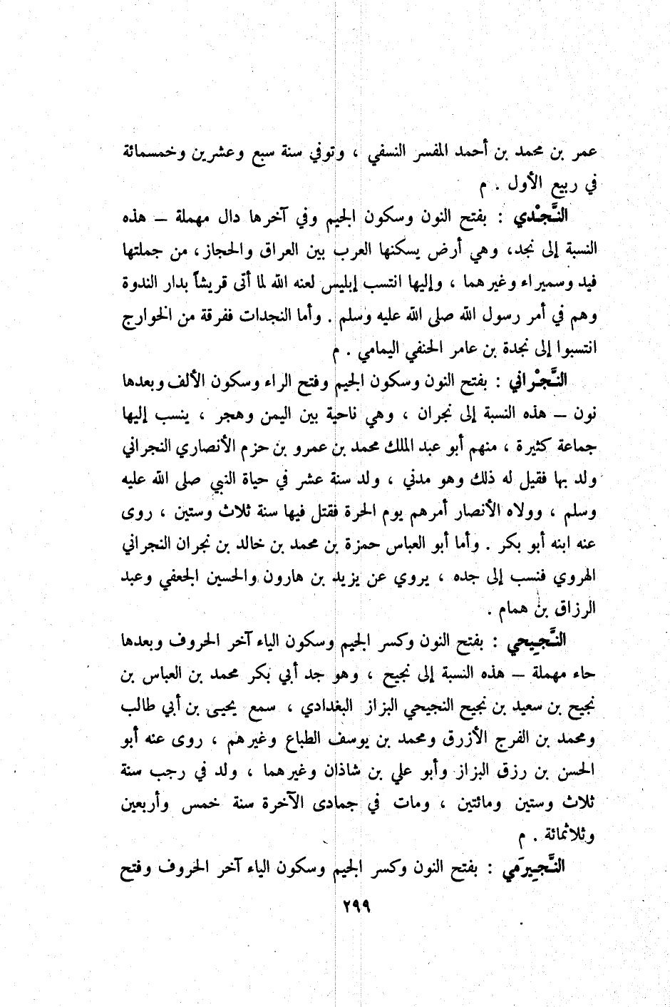 النجدي بِفَتْح النُّون وَسُكُون الْجِيم وَفِي آخرهَا دَال مُهْملَة هَذِه النِّسْبَة إِلَى نجد وَهِي أَرض يسكنهَا الْعَرَب بَين الْعرَاق والحجاز من جُمْلَتهَا فيد وسميراء وَغَيرهمَا وإليها انتسب إِبْلِيس لَعنه الله لما أَتَى قُريْشًا بدار الندوة وهم فِي امْر رَسُول الله صلى الله عَلَيْهِ وَسلم وَأما النجدات ففرقة من الْخَوَارِج انتسبوا إِلَى نجدة بن عَامر الْحَنَفِيّ اليمامي م