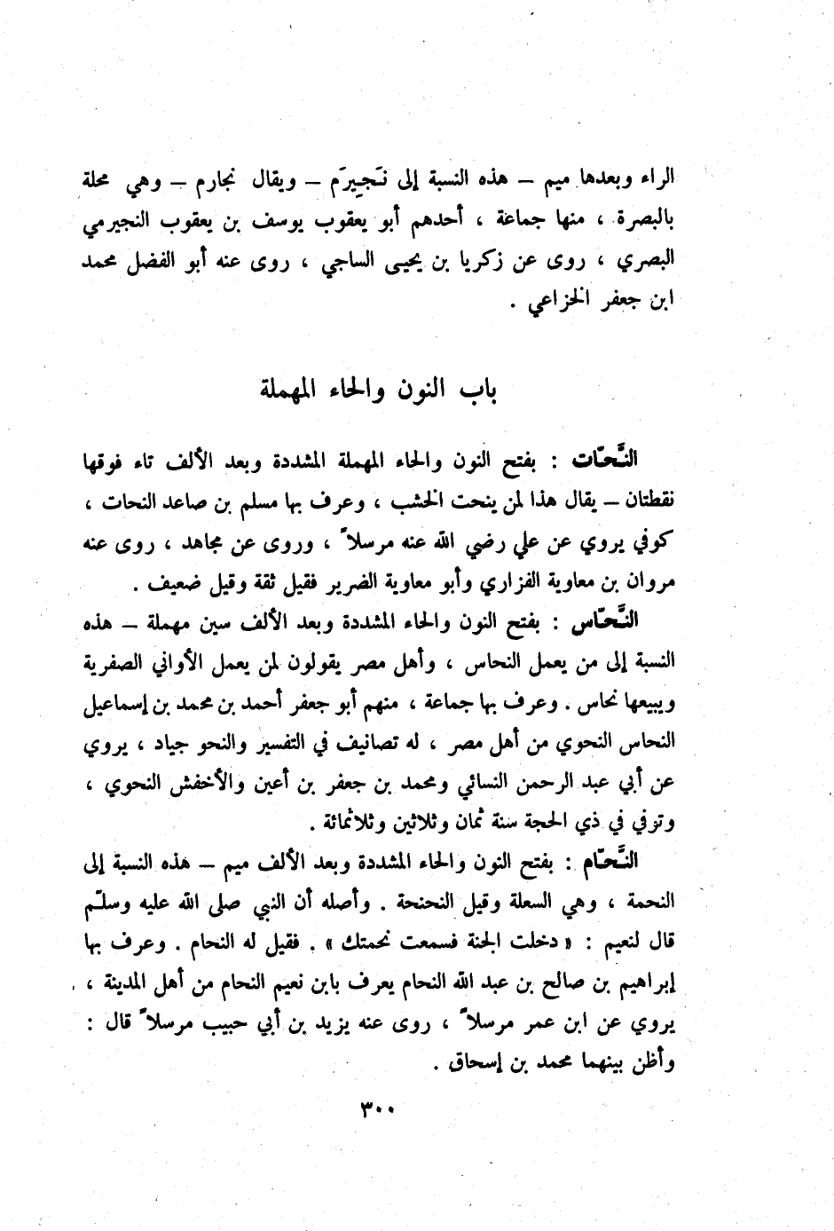 النّحاس بِفَتْح النُّون والحاء الْمُشَدّدَة وَبعد الْألف سين مُهْملَة هَذِه النِّسْبَة إِلَى من يعْمل النّحاس وَأهل مصر يَقُولُونَ لمن يعْمل الْأَوَانِي الصفرية ويبيعها نُحَاس وَعرف بهَا جمَاعَة مِنْهُم أَبُو جَعْفَر أَحْمد بن مُحَمَّد بن إِسْمَاعِيل النّحاس النَّحْوِيّ من أهل مصر لَهُ تصانيف فِي التَّفْسِير والنحو جِيَاد يروي عَن أبي عبد الرَّحْمَن النَّسَائِيّ وَمُحَمّد بن جَعْفَر بن أعين والأخفش النَّحْوِيّ وَتُوفِّي فِي ذِي الْحجَّة سنة ثَمَان وَثَلَاثِينَ وثلاثمائة