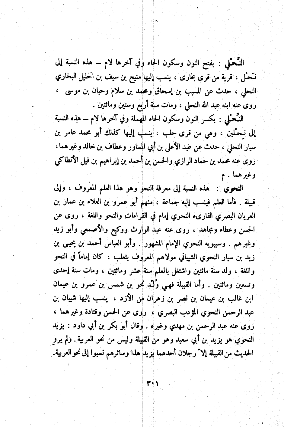 النَّحْوِيّ هَذِه النِّسْبَة إِلَى معرفَة النَّحْو وَهُوَ هَذَا الْعلم الْمَعْرُوف وَإِلَى قَبيلَة فَأَما الْعلم فينسب إِلَيْهِ جمَاعَة مِنْهُم أَبُو عَمْرو بن الْعَلَاء بن عمار بن الْعُرْيَان الْبَصْرِيّ الْقَارئ النَّحْوِيّ إِمَام فِي الْقرَاءَات والنحو واللغة روى عَن الْحسن وَعَطَاء وَمُجاهد روى عَنهُ عبد الْوَارِث ووكيع والأصمعي وَأَبُو زيد وَغَيرهم وسيبويه النَّحْوِيّ الإِمَام الْمَشْهُور وَأَبُو الْعَبَّاس أَحْمد بن يحيى بن زيد بن سيار النَّحْوِيّ الشَّيْبَانِيّ مَوْلَاهُم الْمَعْرُوف بثعلب كَانَ إِمَامًا فِي النَّحْو واللغة ولد سنة مِائَتَيْنِ واشتغل بِالْعلمِ سنة عشر وَمِائَتَيْنِ وَمَات سنة إِحْدَى وَتِسْعين وَمِائَتَيْنِ وَأما الْقَبِيلَة فَهِيَ ولد نَحْو بن شمس بن عَمْرو بن عيمان ابْن غَالب بن عيمان بن نصر بن زهران من الأزد ينْسب إِلَيْهَا شَيبَان بن عبد الرَّحْمَن النَّحْوِيّ الْمُؤَدب الْبَصْرِيّ روى عَن الْحسن وَقَتَادَة وَغَيرهمَا روى عَنهُ عبد الرَّحْمَن بن مهْدي وَغَيره وَقَالَ أَبُو بكر بن أبي دَاوُد يزِيد النَّحْوِيّ هُوَ يزِيد بن أبي سعيد وَهُوَ من الْقَبِيلَة وَلَيْسَ من نَحْو الْعَرَبيَّة وَلم يرو الحَدِيث من الْقَبِيلَة إِلَّا رجلَانِ أَحدهمَا يزِيد هَذَا وسائرهم نسبوا إِلَى نَحْو الْعَرَبيَّة