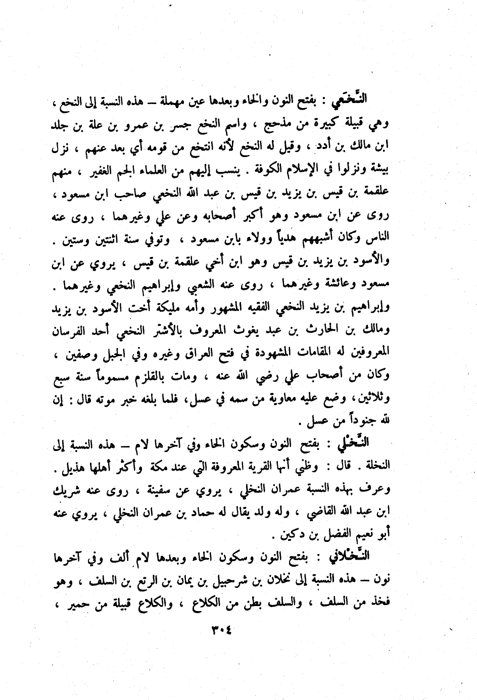 النَّخعِيّ بِفَتْح النُّون وَالْخَاء وَبعدهَا عين مُهْملَة هَذِه النِّسْبَة إِلَى النخع وَهِي قَبيلَة كَبِيرَة من مذْحج وَاسم النخع جسر بن عَمْرو بن عِلّة بن جلد ابْن مَالك بن أدد وَقيل لَهُ النخع لِأَنَّهُ أنتخع من قومه أَي بعد عَنْهُم نزل بيشة ونزلوا فِي الْإِسْلَام الْكُوفَة ينْسب إِلَيْهِم من الْعلمَاء الجم الْغَفِير مِنْهُم عَلْقَمَة بن قيس بن يزِيد بن قيس بن عبد الله النَّخعِيّ صَاحب ابْن مَسْعُود روى عَن ابْن مَسْعُود وَهُوَ أكبر أَصْحَابه وَعَن عَليّ وَغَيرهمَا روى عَنهُ النَّاس وَكَانَ أشبههم هَديا وَوَلَاء بِابْن مَسْعُود وَتُوفِّي سنة اثْنَتَيْنِ وَسِتِّينَ وَالْأسود بن يزِيد بن قيس وَهُوَ أبن أخي عَلْقَمَة بن قيس يروي عَن ابْن مَسْعُود وَعَائِشَة وَغَيرهمَا روى عَنهُ الشّعبِيّ وَإِبْرَاهِيم النَّخعِيّ وَغَيرهمَا وَإِبْرَاهِيم بن يزِيد النَّخعِيّ الْفَقِيه الْمَشْهُور وَأمه مليكَة أُخْت الْأسود بن يزِيد وَمَالك بن الْحَارِث بن عبد يَغُوث الْمَعْرُوف بالأشتر النَّخعِيّ أَحْمد الفرسان المعروفين لَهُ المقامات المشهودة فِي فتح الْعرَاق وَغَيره وَفِي الْجَبَل وصفين وَكَانَ من أَصْحَاب عَليّ رَضِي الله عَنهُ وَمَات بالقلزم مسموما سنة سبع وَثَلَاثِينَ وضع عَلَيْهِ مُعَاوِيَة من سمه فِي عسل فَلَمَّا بلغه خبر مَوته قَالَ إِن لله جُنُودا من عسل