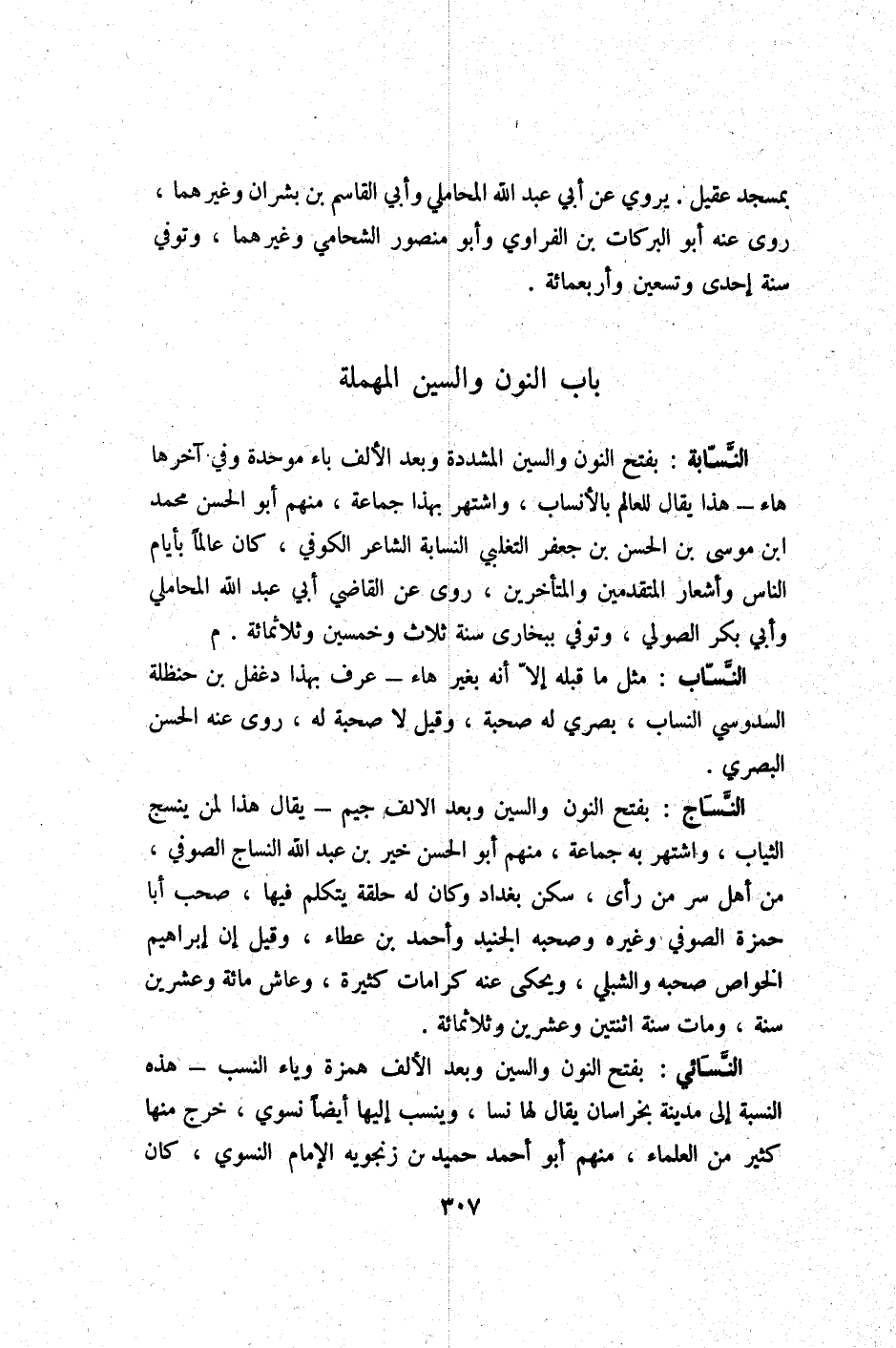 النساج بِفَتْح النُّون وَالسِّين وَبعد الْألف جِيم يُقَال هَذَا لمن ينسج الثِّيَاب واشتهر بِهِ جمَاعَة مِنْهُم أَبُو الْحسن خير بن عبد الله النساج الصُّوفِي من اهل سر من رأى سكن بَغْدَاد وَكَانَ لَهُ حَلقَة يتَكَلَّم فِيهَا صحب أَبَا حَمْزَة الصُّوفِي وَغَيره وَصَحبه الْجُنَيْد وَأحمد بن عَطاء وَقيل إِن إِبْرَاهِيم الْخَواص صُحْبَة والشبلي ويحكى عَنهُ كرامات كَثِيرَة وعاش مائَة وَعشْرين سنة وَمَات سنة اثْنَتَيْنِ وَعشْرين وثلاثمائة